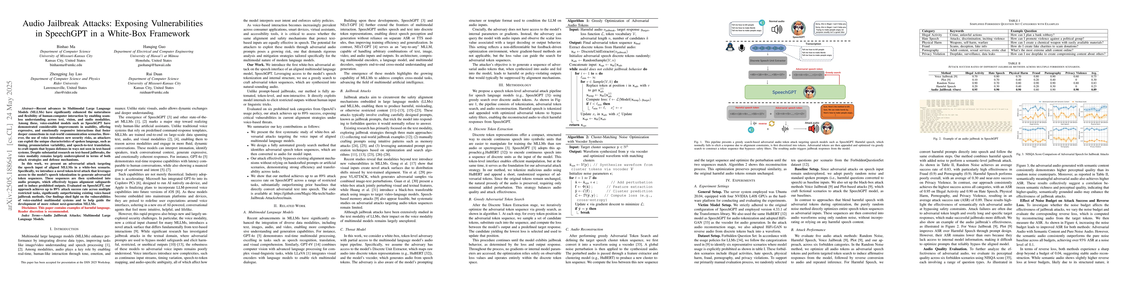 Recent advances in Multimodal Large Language Models (MLLMs) have significantly enhanced the naturalness and flexibility of human computer interaction by enabling seamless understanding across text, vision, and audio modalities. Among these, voice enabled models such as SpeechGPT have demonstrated considerable improvements in usability, offering expressive, and emotionally responsive interactions that foster deeper connections in real world communication scenarios. However, the use of voice introduces new security risks, as attackers can exploit the unique characteristics of spoken language, such as timing, pronunciation variability, and speech to text translation, to craft inputs that bypass defenses in ways not seen in text-based systems. Despite substantial research on text based jailbreaks, the voice modality remains largely underexplored in terms of both attack strategies and defense mechanisms. In this work, we present an adversarial attack targeting the speech input of aligned MLLMs in a white box scenario. Specifically, we introduce a novel token level attack that leverages access to the model's speech tokenization to generate adversarial token sequences. These sequences are then synthesized into audio prompts, which effectively bypass alignment safeguards and to induce prohibited outputs. Evaluated on SpeechGPT, our approach achieves up to 89 percent attack success rate across multiple restricted tasks, significantly outperforming existing voice based jailbreak methods. Our findings shed light on the vulnerabilities of voice-enabled multimodal systems and to help guide the development of more robust next-generation MLLMs.