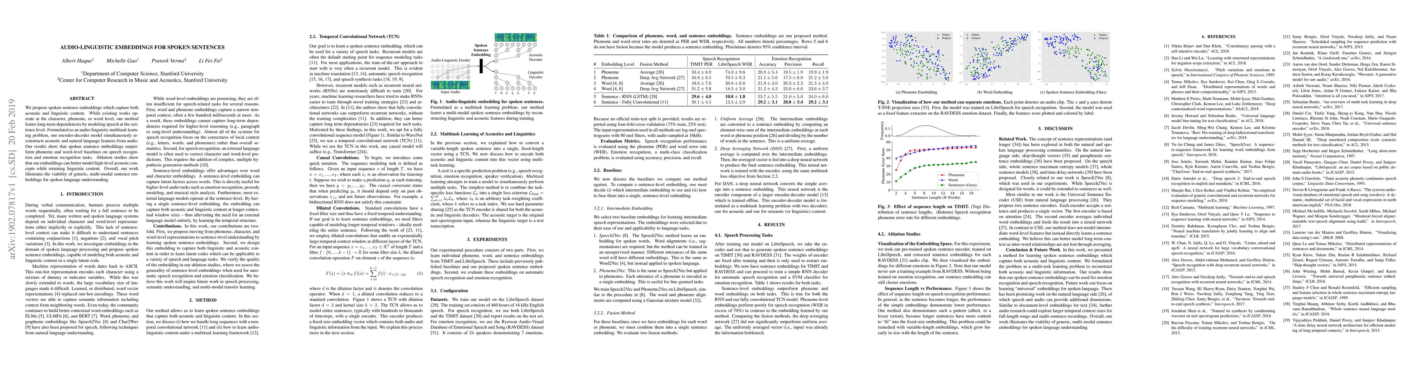 This paper proposes a novel method for generating spoken sentence embeddings that integrate both acoustic and linguistic information, outperforming phoneme and word-level baselines in speech and emotion recognition tasks. The model uses an encoder-decoder architecture for multitask learning, demonstrating the effectiveness of sentence-level modeling for long-term dependencies.