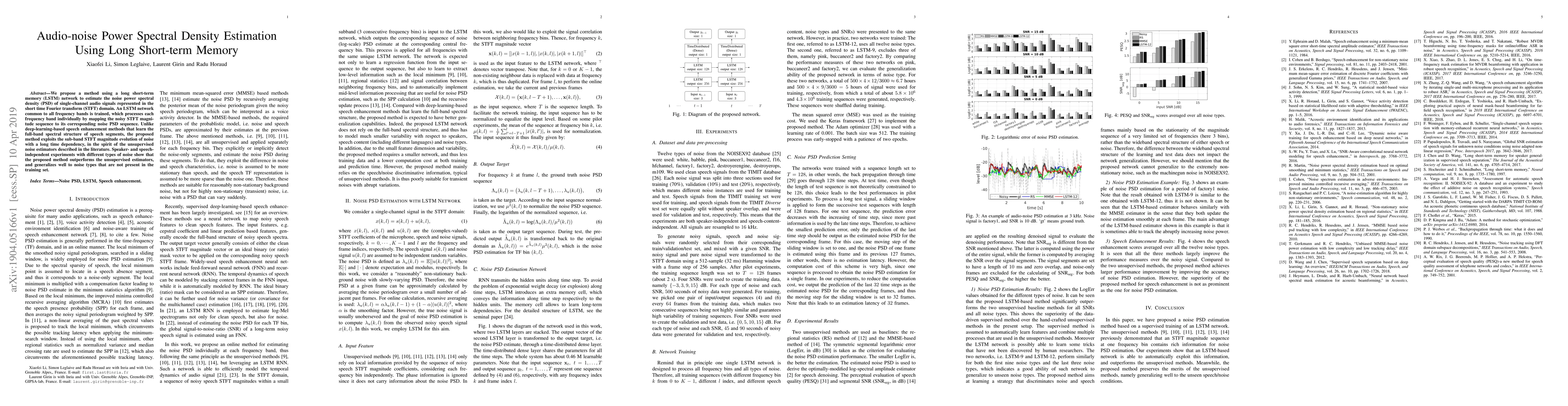 This paper proposes an LSTM network for estimating noise power spectral density in single-channel audio signals using the STFT domain. The method outperforms existing unsupervised estimators and generalizes well to unseen noise types.