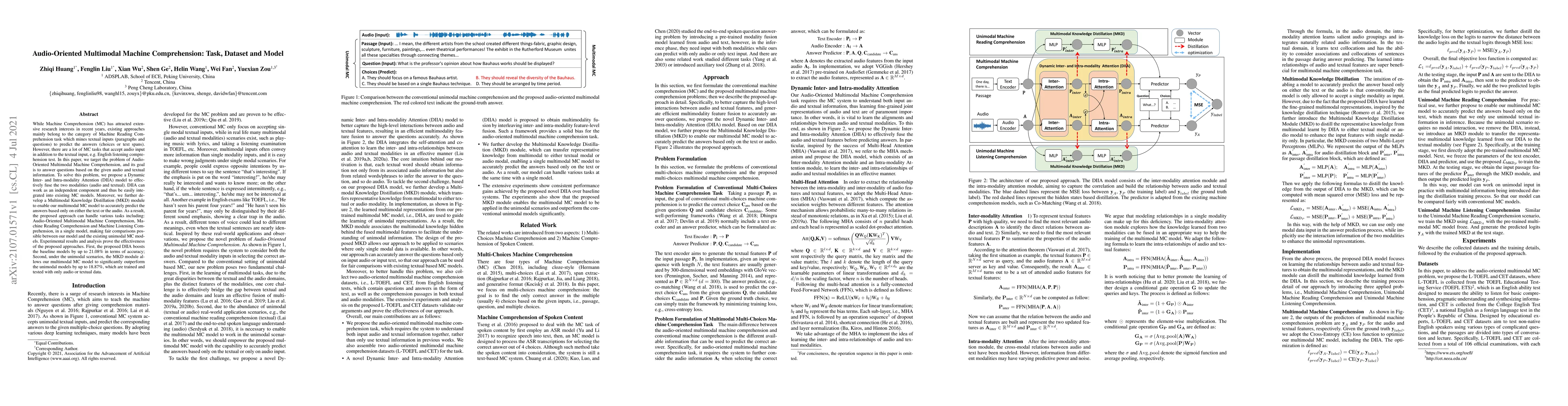 While Machine Comprehension (MC) has attracted extensive research interests in recent years, existing approaches mainly belong to the category of Machine Reading Comprehension task which mines textual inputs (paragraphs and questions) to predict the answers (choices or text spans). However, there are a lot of MC tasks that accept audio input in addition to the textual input, e.g. English listening comprehension test. In this paper, we target the problem of Audio-Oriented Multimodal Machine Comprehension, and its goal is to answer questions based on the given audio and textual information. To solve this problem, we propose a Dynamic Inter- and Intra-modality Attention (DIIA) model to effectively fuse the two modalities (audio and textual). DIIA can work as an independent component and thus be easily integrated into existing MC models. Moreover, we further develop a Multimodal Knowledge Distillation (MKD) module to enable our multimodal MC model to accurately predict the answers based only on either the text or the audio. As a result, the proposed approach can handle various tasks including: Audio-Oriented Multimodal Machine Comprehension, Machine Reading Comprehension and Machine Listening Comprehension, in a single model, making fair comparisons possible between our model and the existing unimodal MC models. Experimental results and analysis prove the effectiveness of the proposed approaches. First, the proposed DIIA boosts the baseline models by up to 21.08% in terms of accuracy; Second, under the unimodal scenarios, the MKD module allows our multimodal MC model to significantly outperform the unimodal models by up to 18.87%, which are trained and tested with only audio or textual data.