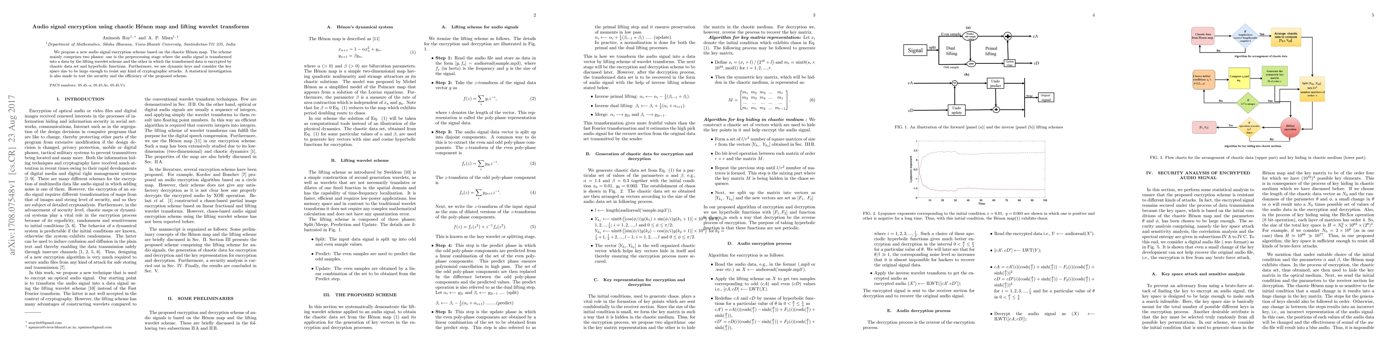 The paper introduces an audio signal encryption method using the chaotic Hénon map and lifting wavelet transforms. It involves preprocessing audio signals into data via lifting wavelets, then encrypting this data with chaotic datasets and hyperbolic functions. The scheme employs dynamic keys for enhanced security, with a large key space to thwart attacks. The security and efficiency of this method are validated through statistical analysis.