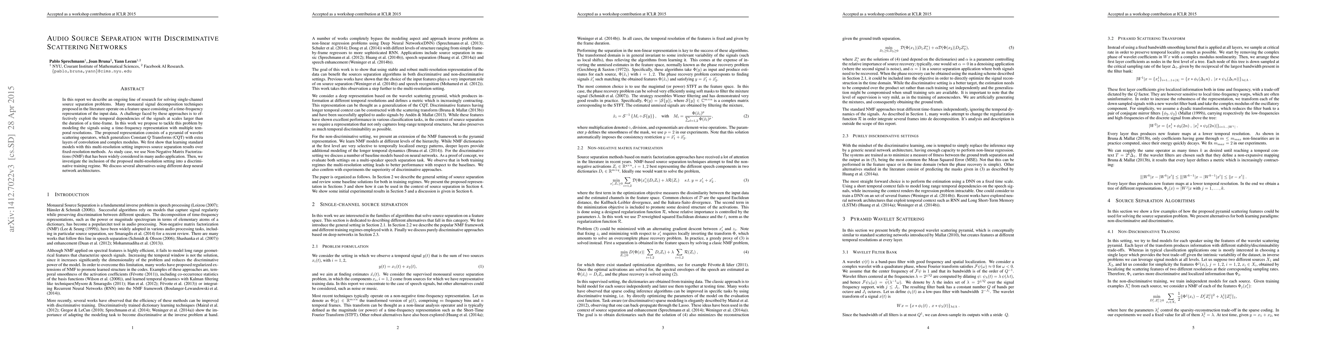 In this report we describe an ongoing line of research for solving single-channel source separation problems. Many monaural signal decomposition techniques proposed in the literature operate on a feature space consisting of a time-frequency representation of the input data. A challenge faced by these approaches is to effectively exploit the temporal dependencies of the signals at scales larger than the duration of a time-frame. In this work we propose to tackle this problem by modeling the signals using a time-frequency representation with multiple temporal resolutions. The proposed representation consists of a pyramid of wavelet scattering operators, which generalizes Constant Q Transforms (CQT) with extra layers of convolution and complex modulus. We first show that learning standard models with this multi-resolution setting improves source separation results over fixed-resolution methods. As study case, we use Non-Negative Matrix Factorizations (NMF) that has been widely considered in many audio application. Then, we investigate the inclusion of the proposed multi-resolution setting into a discriminative training regime. We discuss several alternatives using different deep neural network architectures.