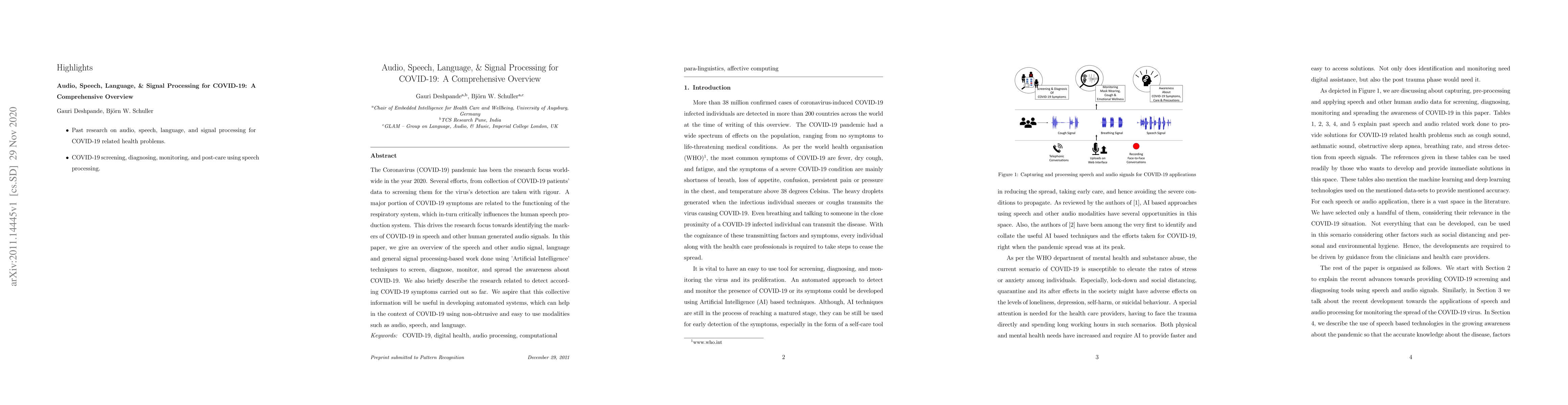 The Coronavirus (COVID-19) pandemic has been the research focus world-wide in the year 2020. Several efforts, from collection of COVID-19 patients' data to screening them for the virus's detection are taken with rigour. A major portion of COVID-19 symptoms are related to the functioning of the respiratory system, which in-turn critically influences the human speech production system. This drives the research focus towards identifying the markers of COVID-19 in speech and other human generated audio signals. In this paper, we give an overview of the speech and other audio signal, language and general signal processing-based work done using Artificial Intelligence techniques to screen, diagnose, monitor, and spread the awareness aboutCOVID-19. We also briefly describe the research related to detect accord-ing COVID-19 symptoms carried out so far. We aspire that this collective information will be useful in developing automated systems, which can help in the context of COVID-19 using non-obtrusive and easy to use modalities such as audio, speech, and language.