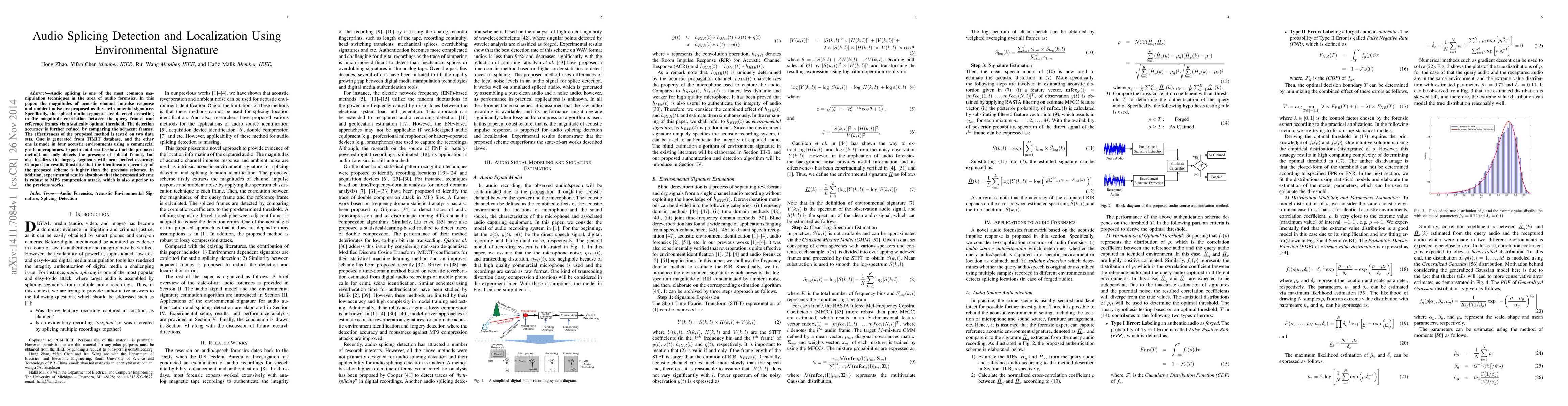 A new audio splicing detection method uses environmental signatures to identify and localize manipulated audio segments with high accuracy. The proposed scheme outperforms previous methods in both detection and localization accuracy, also showing robustness against MP3 compression attacks.