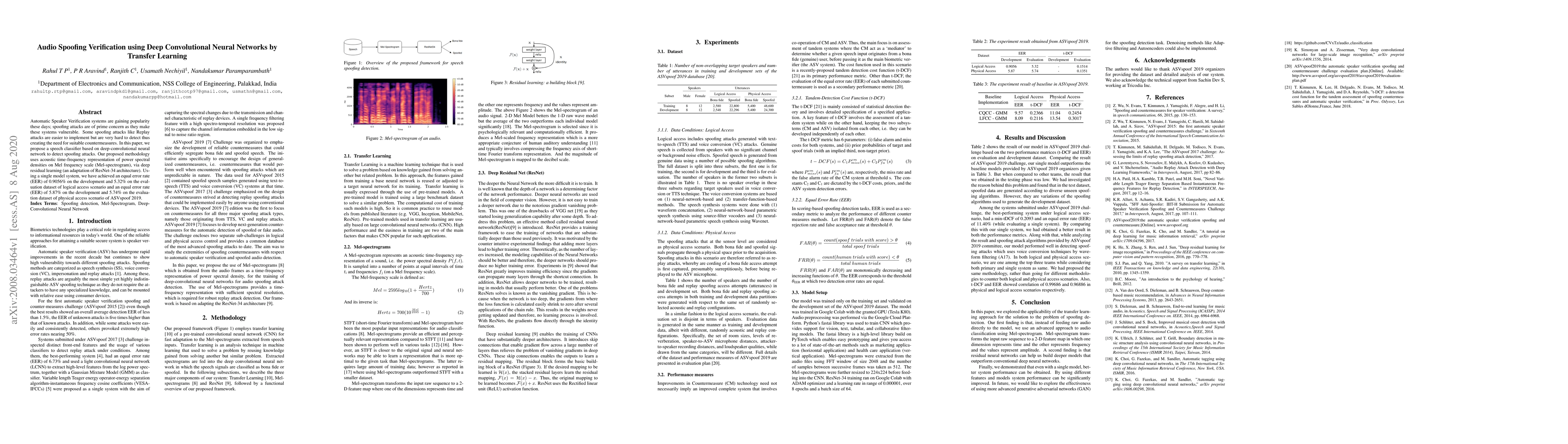 Automatic Speaker Verification systems are gaining popularity these days; spoofing attacks are of prime concern as they make these systems vulnerable. Some spoofing attacks like Replay attacks are easier to implement but are very hard to detect thus creating the need for suitable countermeasures. In this paper, we propose a speech classifier based on deep-convolutional neural network to detect spoofing attacks. Our proposed methodology uses acoustic time-frequency representation of power spectral densities on Mel frequency scale (Mel-spectrogram), via deep residual learning (an adaptation of ResNet-34 architecture). Using a single model system, we have achieved an equal error rate (EER) of 0.9056% on the development and 5.32% on the evaluation dataset of logical access scenario and an equal error rate (EER) of 5.87% on the development and 5.74% on the evaluation dataset of physical access scenario of ASVspoof 2019.