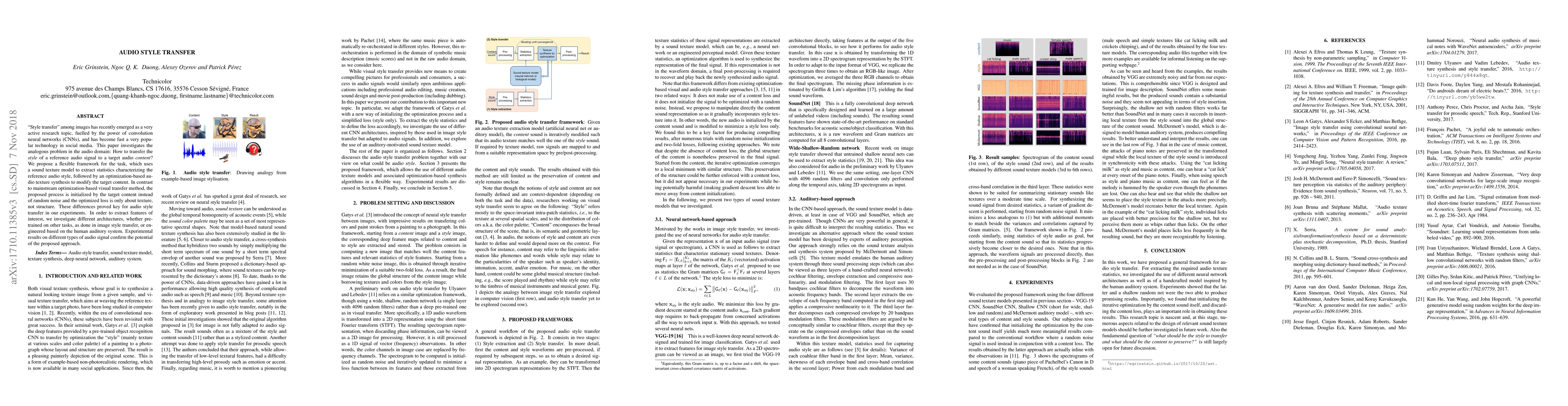 'Style transfer' among images has recently emerged as a very active research topic, fuelled by the power of convolution neural networks (CNNs), and has become fast a very popular technology in social media. This paper investigates the analogous problem in the audio domain: How to transfer the style of a reference audio signal to a target audio content? We propose a flexible framework for the task, which uses a sound texture model to extract statistics characterizing the reference audio style, followed by an optimization-based audio texture synthesis to modify the target content. In contrast to mainstream optimization-based visual transfer method, the proposed process is initialized by the target content instead of random noise and the optimized loss is only about texture, not structure. These differences proved key for audio style transfer in our experiments. In order to extract features of interest, we investigate different architectures, whether pre-trained on other tasks, as done in image style transfer, or engineered based on the human auditory system. Experimental results on different types of audio signal confirm the potential of the proposed approach.