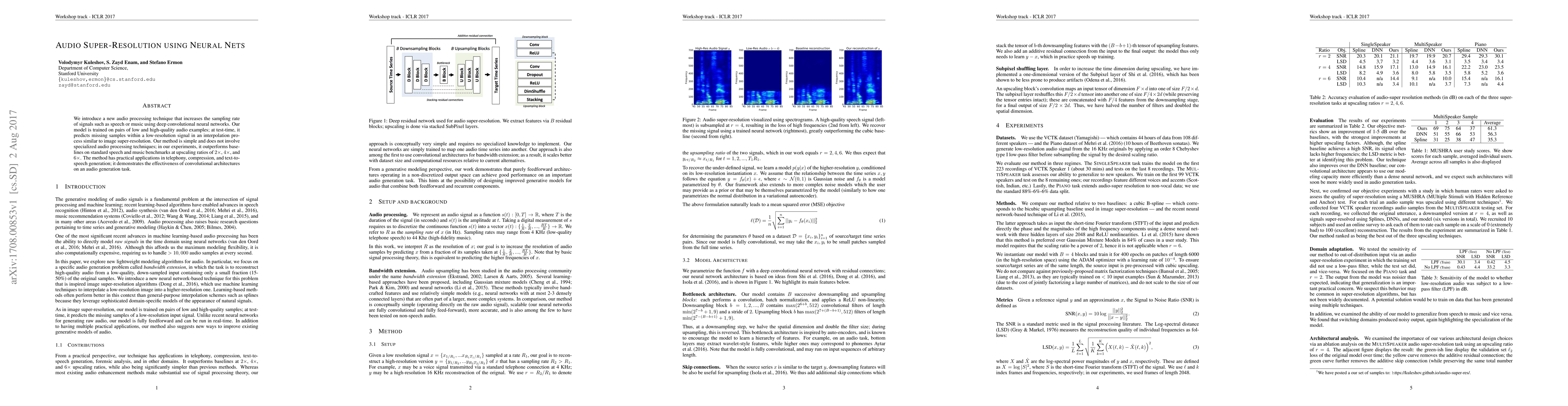 This paper proposes a neural network-based method for audio super resolution, enhancing sampling rates of speech and music using deep convolutional networks. The model, trained on low and high-resolution audio pairs, outperforms baselines on standard benchmarks, showing practical applications in telephony and text-to-speech.