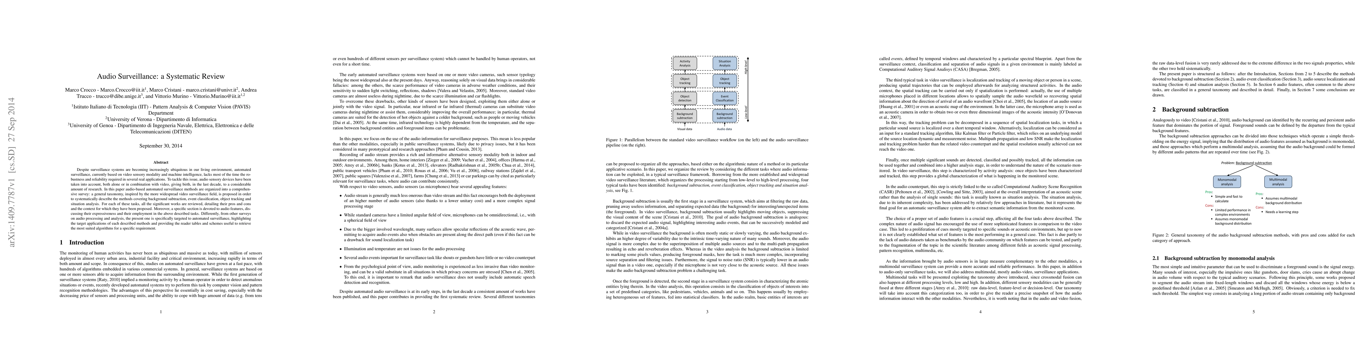 A systematic review of audio-based surveillance methods explores their effectiveness in tasks like background subtraction, event classification, and object tracking. The study aims to provide a comprehensive framework for selecting suitable algorithms for specific applications.