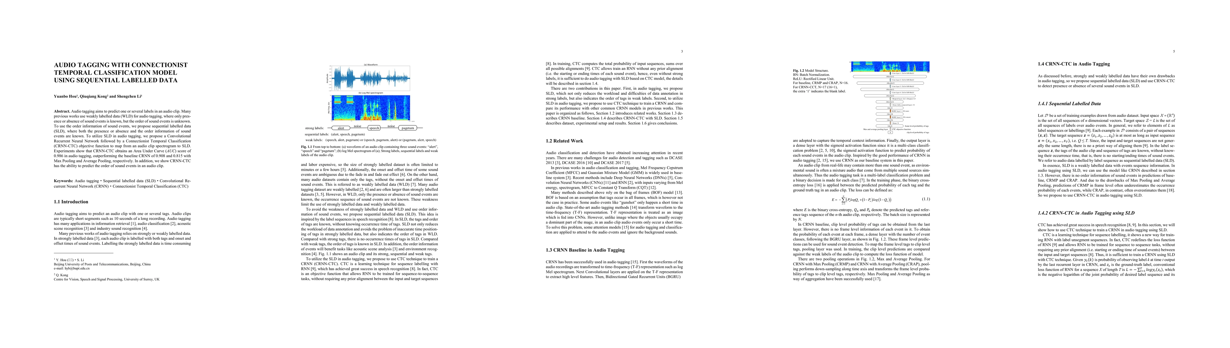 Audio tagging aims to predict one or several labels in an audio clip. Many previous works use weakly labelled data (WLD) for audio tagging, where only presence or absence of sound events is known, but the order of sound events is unknown. To use the order information of sound events, we propose sequential labelled data (SLD), where both the presence or absence and the order information of sound events are known. To utilize SLD in audio tagging, we propose a Convolutional Recurrent Neural Network followed by a Connectionist Temporal Classification (CRNN-CTC) objective function to map from an audio clip spectrogram to SLD. Experiments show that CRNN-CTC obtains an Area Under Curve (AUC) score of 0.986 in audio tagging, outperforming the baseline CRNN of 0.908 and 0.815 with Max Pooling and Average Pooling, respectively. In addition, we show CRNN-CTC has the ability to predict the order of sound events in an audio clip.