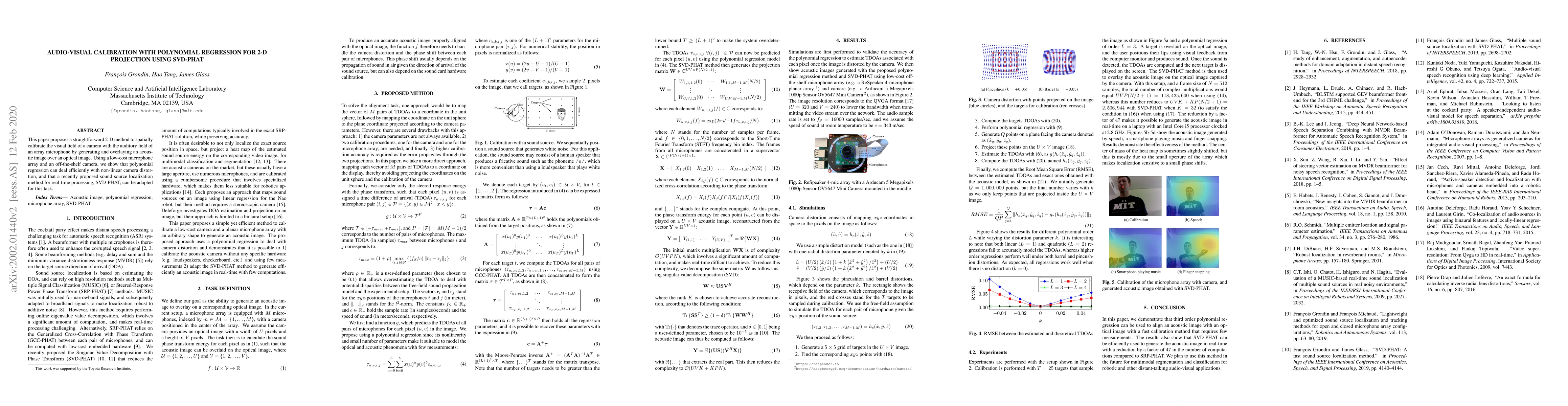 This paper presents a cost-effective 2-D calibration method that aligns the visual field of a camera with the auditory field of an array microphone using polynomial regression and the SVD-PHAT sound localization technique. The method demonstrates efficient handling of camera distortion and real-time processing capabilities.