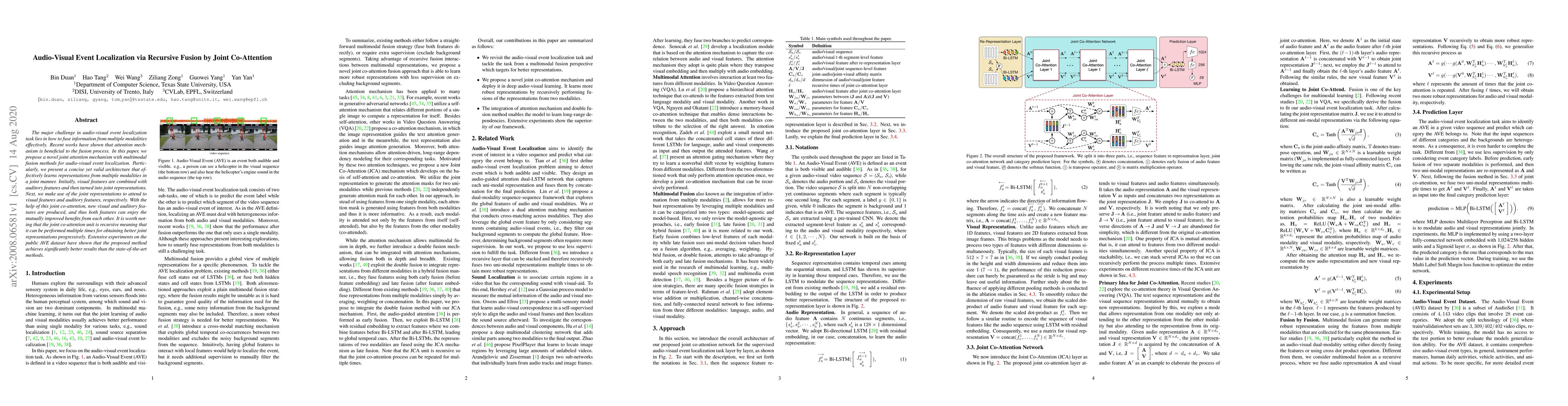 This paper proposes a recursive fusion method using joint co-attention for audio-visual event localization, combining visual and auditory features to progressively enhance each modality's representation, achieving superior performance on the AVE dataset compared to state-of-the-art techniques.