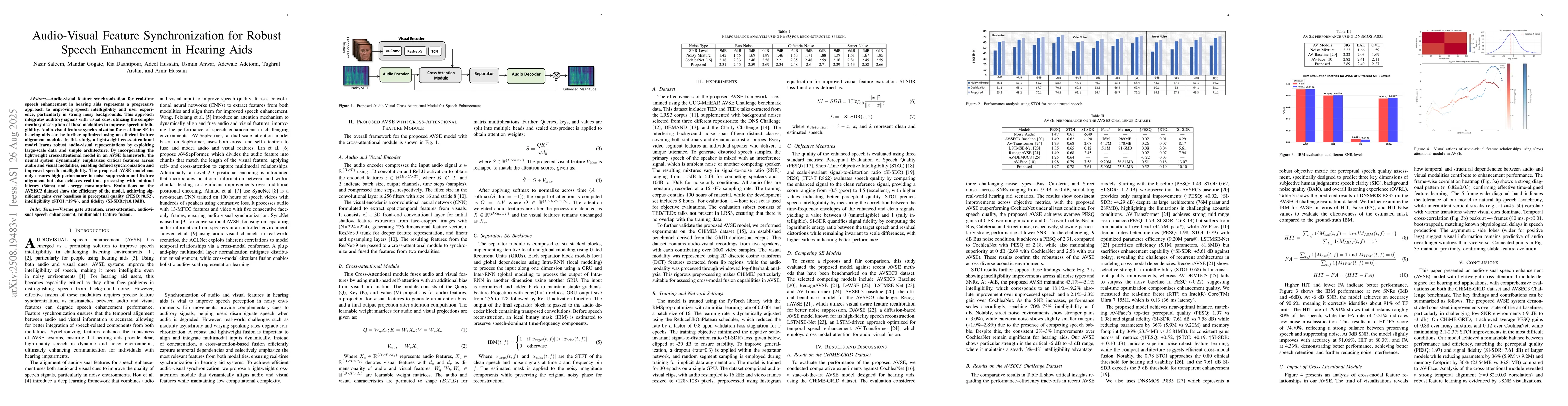 Audio-visual feature synchronization for real-time speech enhancement in hearing aids represents a progressive approach to improving speech intelligibility and user experience, particularly in strong noisy backgrounds. This approach integrates auditory signals with visual cues, utilizing the complementary description of these modalities to improve speech intelligibility. Audio-visual feature synchronization for real-time SE in hearing aids can be further optimized using an efficient feature alignment module. In this study, a lightweight cross-attentional model learns robust audio-visual representations by exploiting large-scale data and simple architecture. By incorporating the lightweight cross-attentional model in an AVSE framework, the neural system dynamically emphasizes critical features across audio and visual modalities, enabling defined synchronization and improved speech intelligibility. The proposed AVSE model not only ensures high performance in noise suppression and feature alignment but also achieves real-time processing with minimal latency (36ms) and energy consumption. Evaluations on the AVSEC3 dataset show the efficiency of the model, achieving significant gains over baselines in perceptual quality (PESQ:0.52), intelligibility (STOI:19\%), and fidelity (SI-SDR:10.10dB).