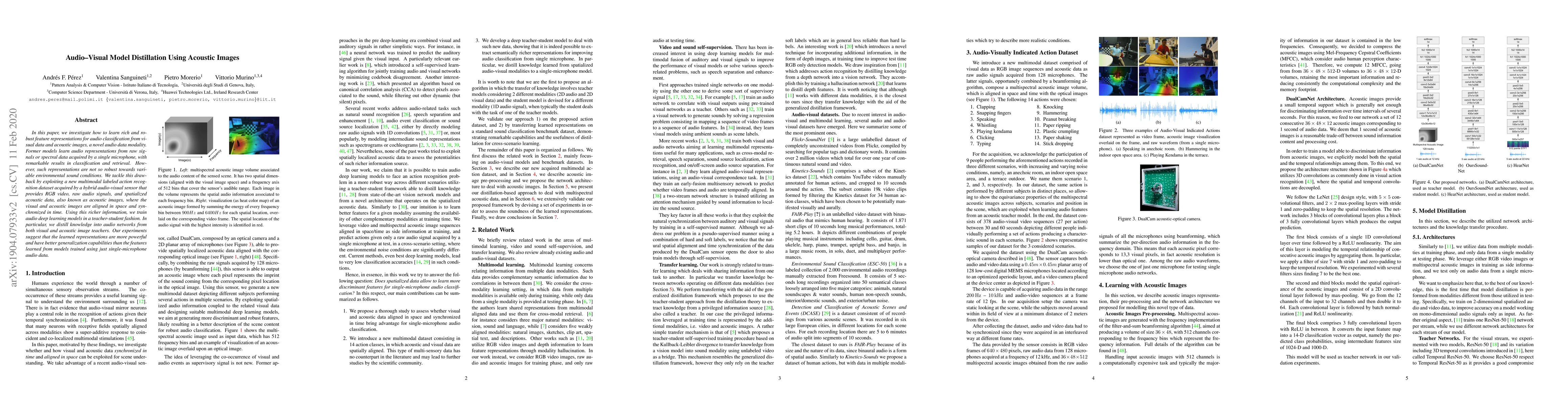 In this paper, we investigate how to learn rich and robust feature representations for audio classification from visual data and acoustic images, a novel audio data modality. Former models learn audio representations from raw signals or spectral data acquired by a single microphone, with remarkable results in classification and retrieval. However, such representations are not so robust towards variable environmental sound conditions. We tackle this drawback by exploiting a new multimodal labeled action recognition dataset acquired by a hybrid audio-visual sensor that provides RGB video, raw audio signals, and spatialized acoustic data, also known as acoustic images, where the visual and acoustic images are aligned in space and synchronized in time. Using this richer information, we train audio deep learning models in a teacher-student fashion. In particular, we distill knowledge into audio networks from both visual and acoustic image teachers. Our experiments suggest that the learned representations are more powerful and have better generalization capabilities than the features learned from models trained using just single-microphone audio data.