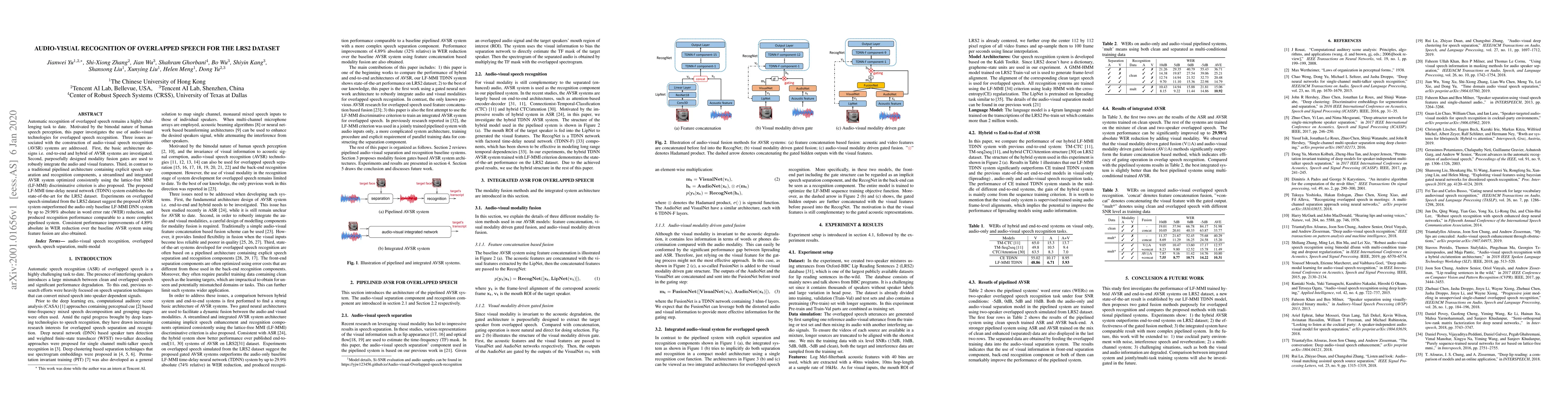 Automatic recognition of overlapped speech remains a highly challenging task to date. Motivated by the bimodal nature of human speech perception, this paper investigates the use of audio-visual technologies for overlapped speech recognition. Three issues associated with the construction of audio-visual speech recognition (AVSR) systems are addressed. First, the basic architecture designs i.e. end-to-end and hybrid of AVSR systems are investigated. Second, purposefully designed modality fusion gates are used to robustly integrate the audio and visual features. Third, in contrast to a traditional pipelined architecture containing explicit speech separation and recognition components, a streamlined and integrated AVSR system optimized consistently using the lattice-free MMI (LF-MMI) discriminative criterion is also proposed. The proposed LF-MMI time-delay neural network (TDNN) system establishes the state-of-the-art for the LRS2 dataset. Experiments on overlapped speech simulated from the LRS2 dataset suggest the proposed AVSR system outperformed the audio only baseline LF-MMI DNN system by up to 29.98\% absolute in word error rate (WER) reduction, and produced recognition performance comparable to a more complex pipelined system. Consistent performance improvements of 4.89\% absolute in WER reduction over the baseline AVSR system using feature fusion are also obtained.