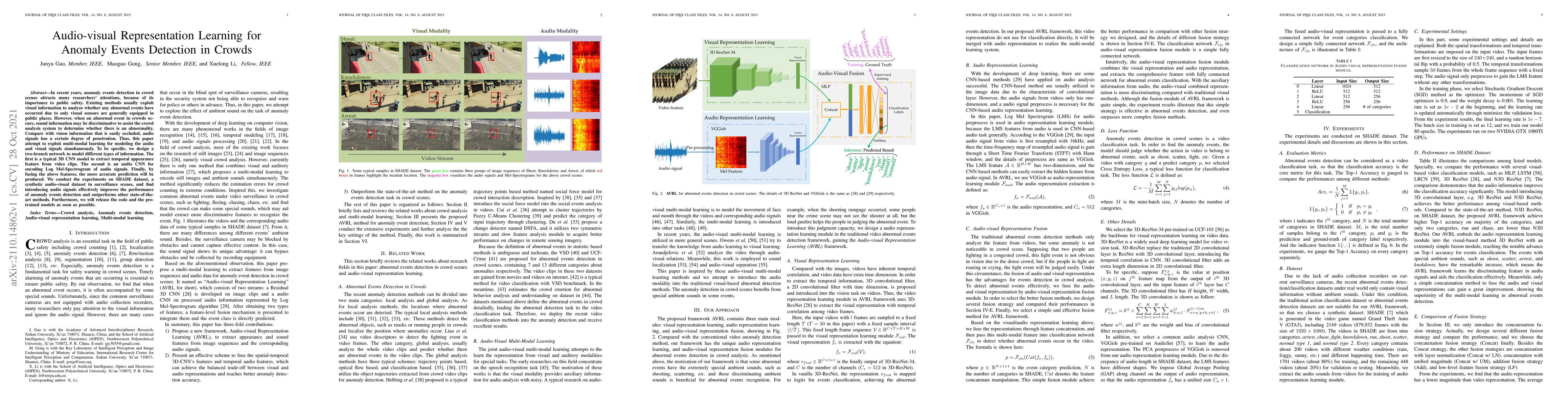 This paper proposes an audio-visual representation learning method for detecting anomaly events in crowded scenes using a two-branch network combining 3D CNN for visual features and audio CNN for audio signals, achieving better performance than existing visual-only methods. Experiments on the SHADE dataset show significant improvements in anomaly detection.