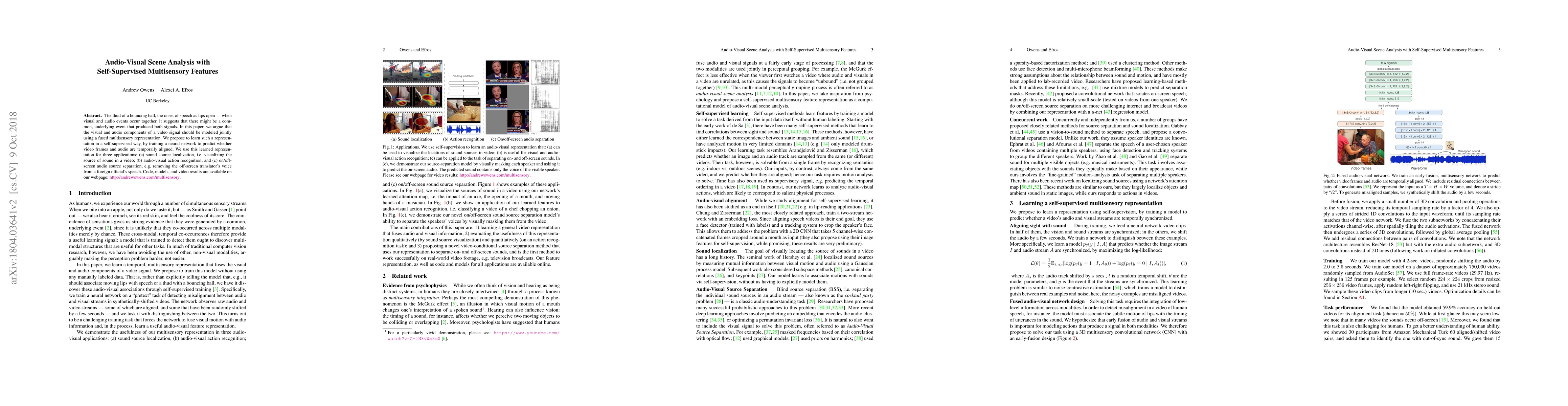 This paper proposes a self-supervised method to learn a joint multisensory representation from video and audio data by predicting temporal alignment, and applies it to sound source localization, audio-visual action recognition, and on/off-screen audio source separation. Models and results are shared online.