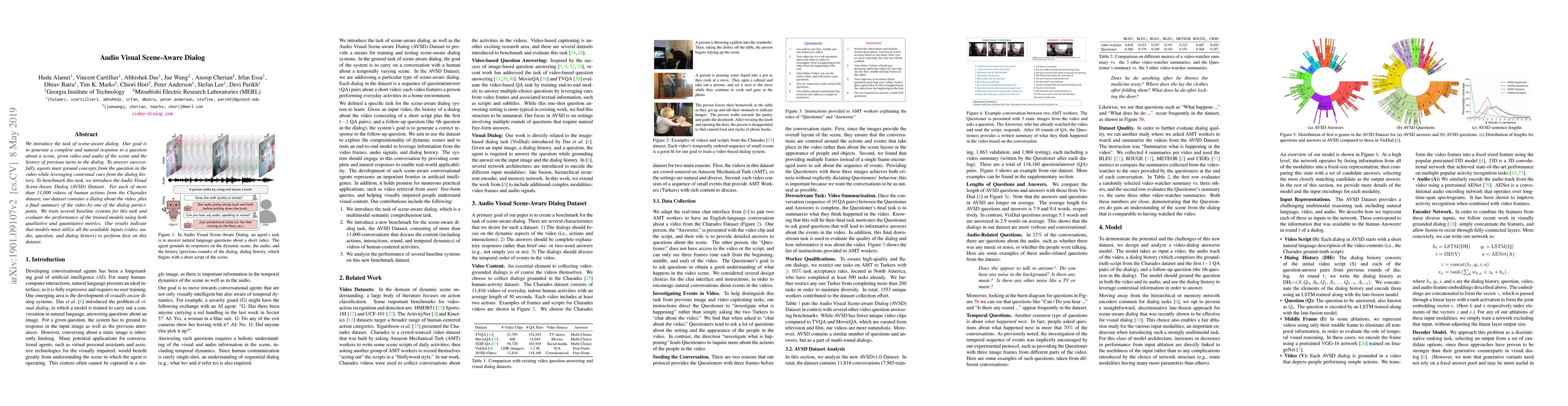 This research introduces the scene-aware dialog task, aiming to generate natural responses to questions about a scene using video, audio, and dialog history. The study benchmarks this with the AVSD Dataset, which includes dialog and summaries for over 11,000 Charades videos, and finds that optimal performance requires integrating all input modalities.