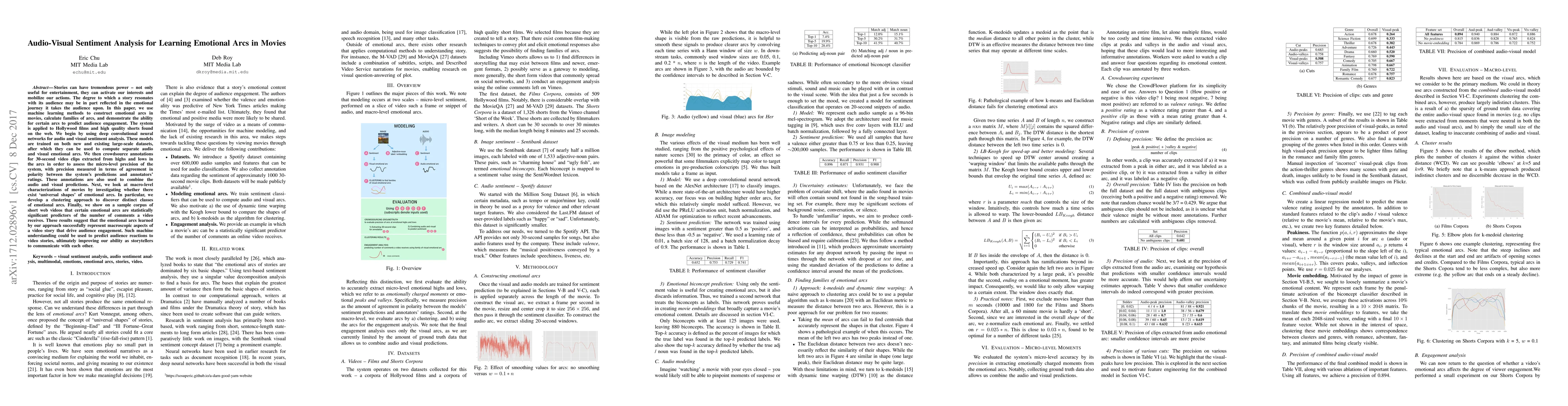 This paper develops a machine learning system to analyze audio-visual sentiment in movies to construct emotional arcs, which are then clustered to identify universal shapes. The study shows that certain emotional arcs predict audience engagement, suggesting the potential to forecast viewer reactions based on story emotional trajectories.