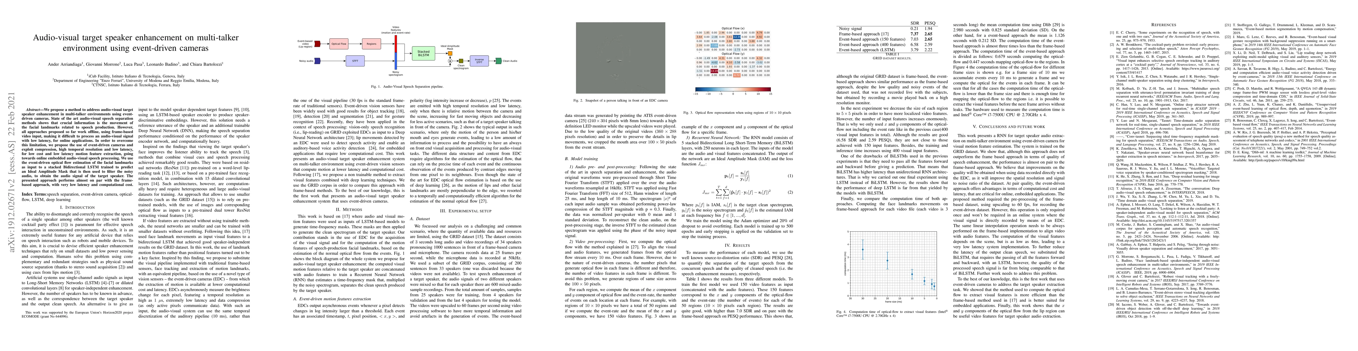 This paper proposes an audio-visual target speaker enhancement method using event-driven cameras for real-time applications in multi-talker environments. It leverages event-driven optical flow for low-latency facial landmark extraction, feeding it into a stacked Bidirectional LSTM to predict an Ideal Amplitude Mask for audio signal separation, achieving comparable performance to frame-based methods with significantly lower latency and computational cost.