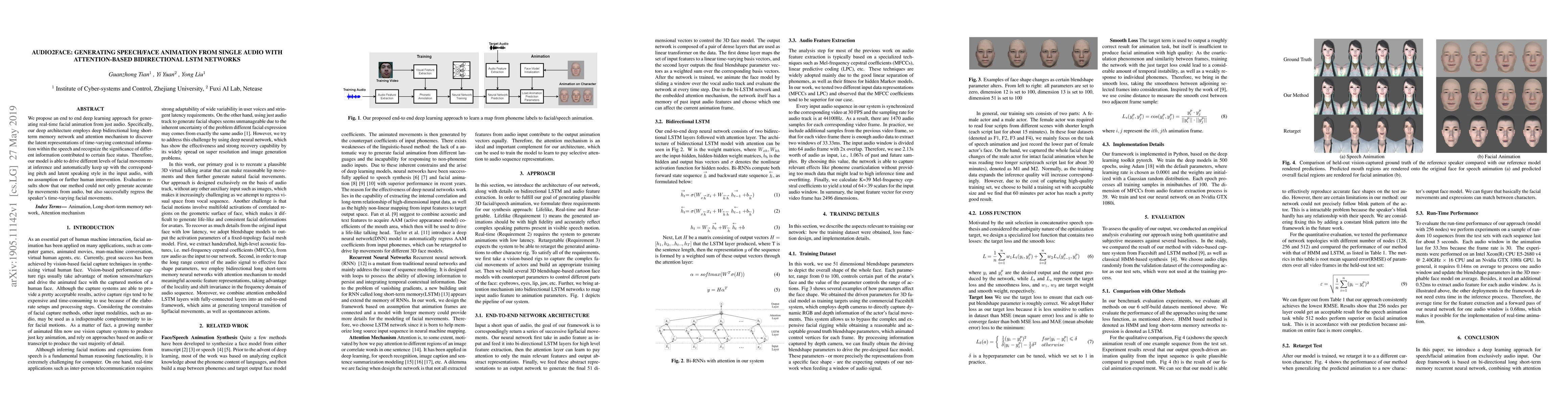 We propose an end to end deep learning approach for generating real-time facial animation from just audio. Specifically, our deep architecture employs deep bidirectional long short-term memory network and attention mechanism to discover the latent representations of time-varying contextual information within the speech and recognize the significance of different information contributed to certain face status. Therefore, our model is able to drive different levels of facial movements at inference and automatically keep up with the corresponding pitch and latent speaking style in the input audio, with no assumption or further human intervention. Evaluation results show that our method could not only generate accurate lip movements from audio, but also successfully regress the speaker's time-varying facial movements.