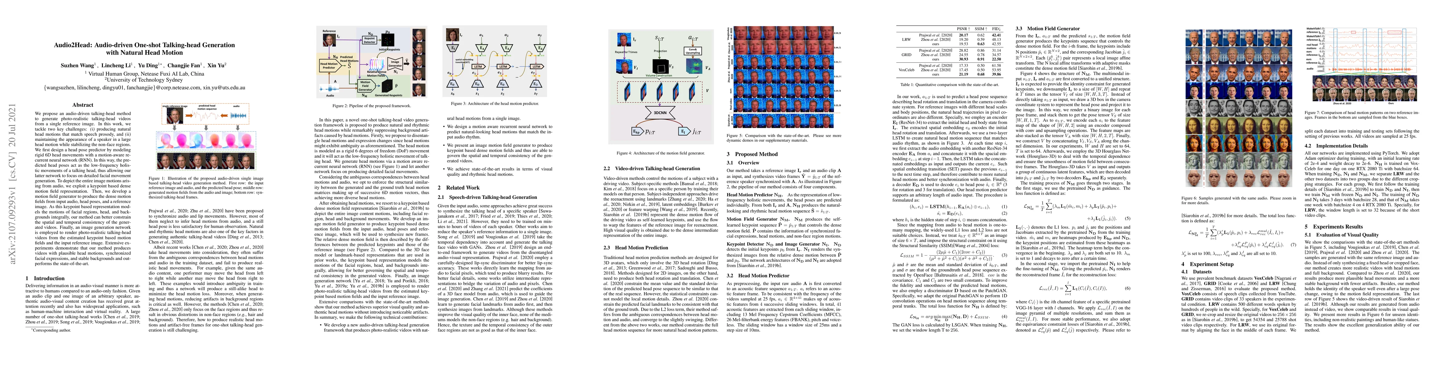 The paper proposes an audio-driven method for generating photo-realistic talking-head videos from a single reference image, addressing natural head motion synchronization and appearance preservation. It employs a head pose predictor and a motion field generator to create synchronized head motions and facial expressions, ultimately producing videos that outperform existing techniques.