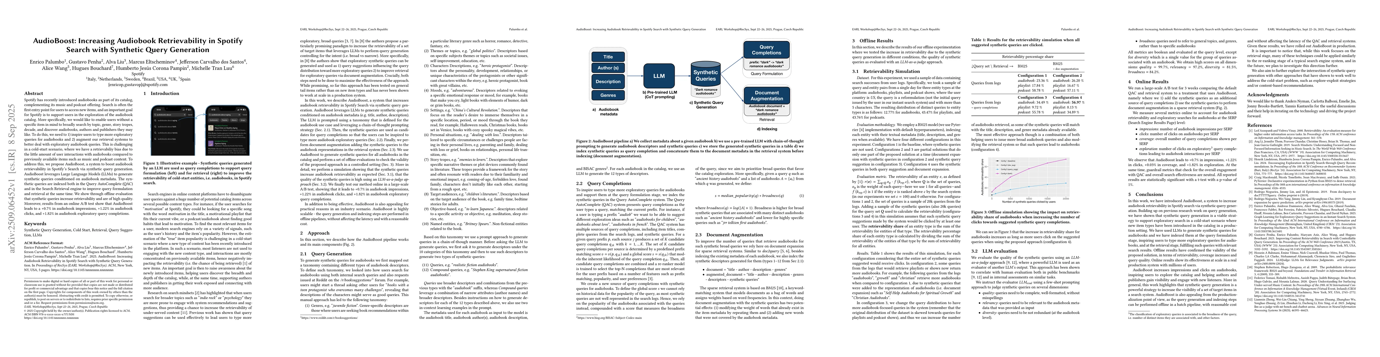 Spotify has recently introduced audiobooks as part of its catalog, complementing its music and podcast offering. Search is often the first entry point for users to access new items, and an important goal for Spotify is to support users in the exploration of the audiobook catalog. More specifically, we would like to enable users without a specific item in mind to broadly search by topic, genre, story tropes, decade, and discover audiobooks, authors and publishers they may like. To do this, we need to 1) inspire users to type more exploratory queries for audiobooks and 2) augment our retrieval systems to better deal with exploratory audiobook queries. This is challenging in a cold-start scenario, where we have a retrievabiliy bias due to the little amount of user interactions with audiobooks compared to previously available items such as music and podcast content. To address this, we propose AudioBoost, a system to boost audiobook retrievability in Spotify's Search via synthetic query generation. AudioBoost leverages Large Language Models (LLMs) to generate synthetic queries conditioned on audiobook metadata. The synthetic queries are indexed both in the Query AutoComplete (QAC) and in the Search Retrieval engine to improve query formulation and retrieval at the same time. We show through offline evaluation that synthetic queries increase retrievability and are of high quality. Moreover, results from an online A/B test show that AudioBoost leads to a +0.7% in audiobook impressions, +1.22% in audiobook clicks, and +1.82% in audiobook exploratory query completions.