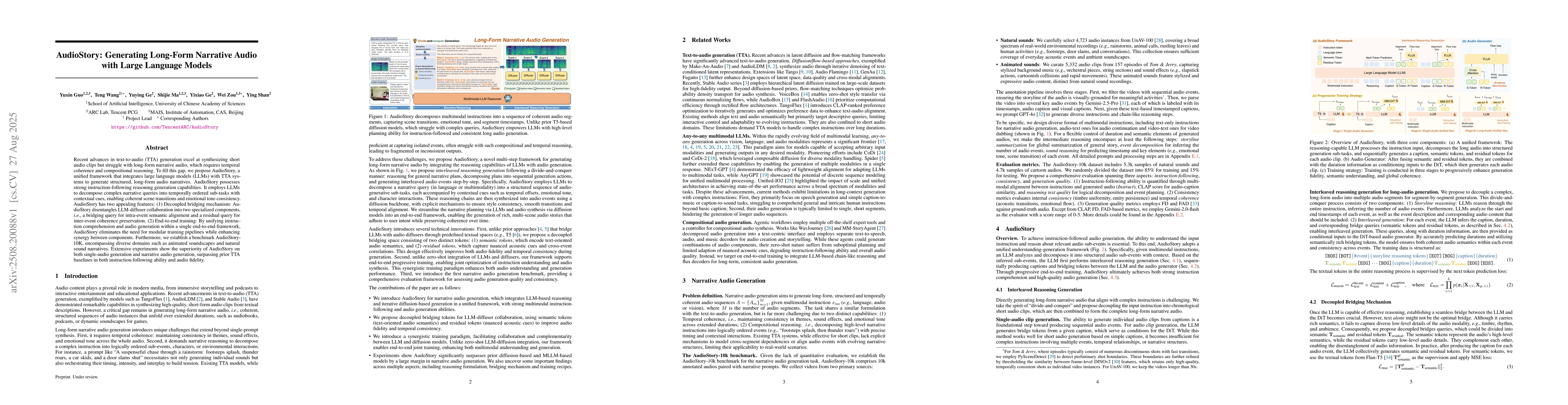 Recent advances in text-to-audio (TTA) generation excel at synthesizing short audio clips but struggle with long-form narrative audio, which requires temporal coherence and compositional reasoning. To address this gap, we propose AudioStory, a unified framework that integrates large language models (LLMs) with TTA systems to generate structured, long-form audio narratives. AudioStory possesses strong instruction-following reasoning generation capabilities. It employs LLMs to decompose complex narrative queries into temporally ordered sub-tasks with contextual cues, enabling coherent scene transitions and emotional tone consistency. AudioStory has two appealing features: (1) Decoupled bridging mechanism: AudioStory disentangles LLM-diffuser collaboration into two specialized components, i.e., a bridging query for intra-event semantic alignment and a residual query for cross-event coherence preservation. (2) End-to-end training: By unifying instruction comprehension and audio generation within a single end-to-end framework, AudioStory eliminates the need for modular training pipelines while enhancing synergy between components. Furthermore, we establish a benchmark AudioStory-10K, encompassing diverse domains such as animated soundscapes and natural sound narratives. Extensive experiments show the superiority of AudioStory on both single-audio generation and narrative audio generation, surpassing prior TTA baselines in both instruction-following ability and audio fidelity. Our code is available at https://github.com/TencentARC/AudioStory