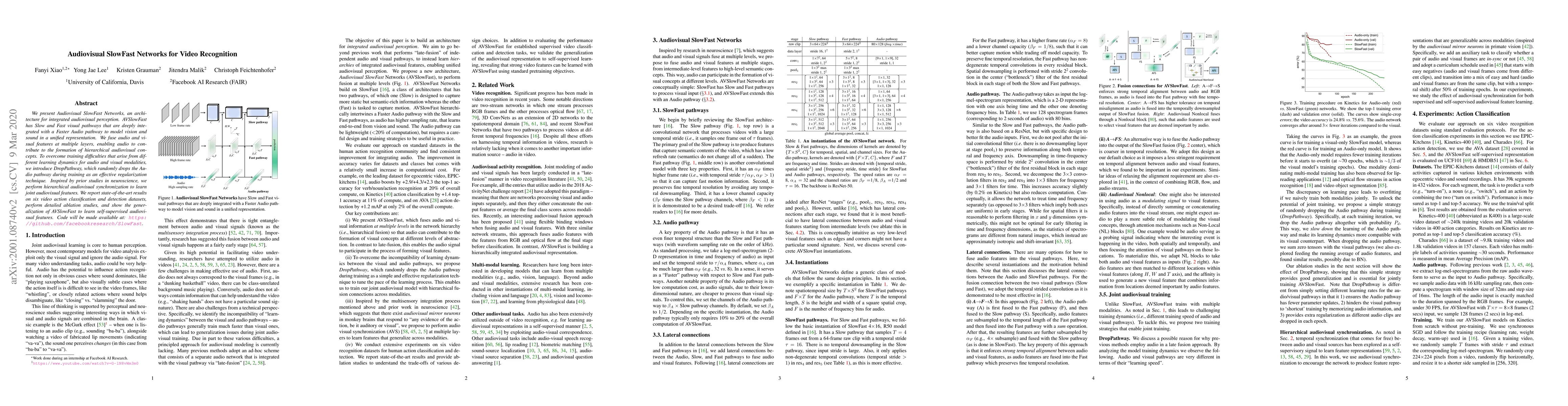 This paper introduces Audiovisual SlowFast Networks, an architecture that integrates visual and audio pathways to model joint audiovisual concepts. The proposed method achieves state-of-the-art results on video recognition tasks by fusing features at multiple layers and employing DropPathway regularization to address training challenges.