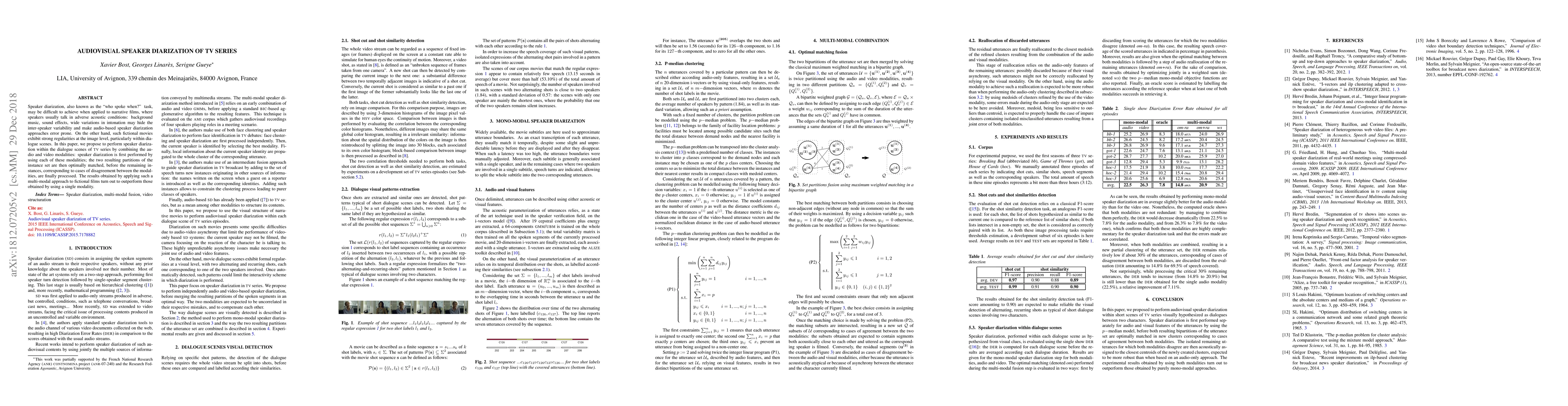 This paper proposes a multi-modal approach to speaker diarization in TV series, combining audio and video analysis to overcome challenges posed by adverse acoustic conditions and leveraging strong visual regularities in dialogue scenes. The method outperforms audio-only approaches by optimally matching the results from both modalities.