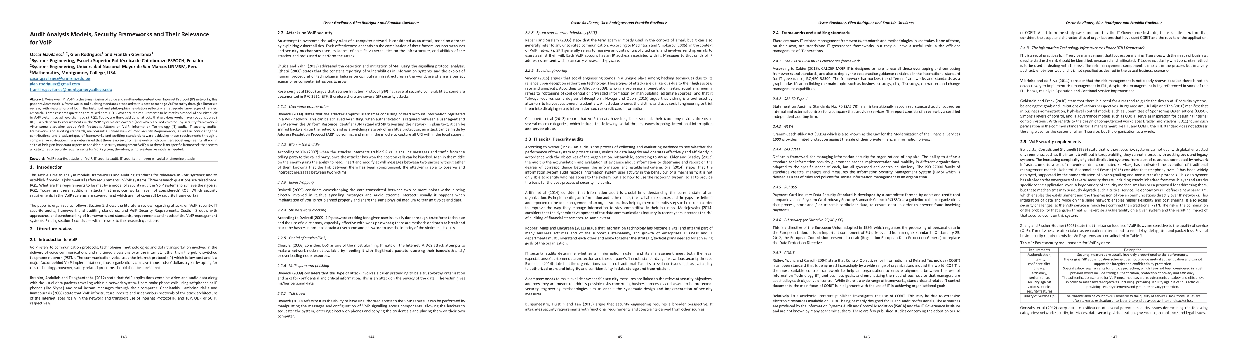 This paper reviews existing models, frameworks, and auditing standards for VoIP security, highlighting their evolution and relevance. It finds that no current framework adequately addresses social engineering attacks or covers all security requirements, suggesting the need for a more comprehensive model.