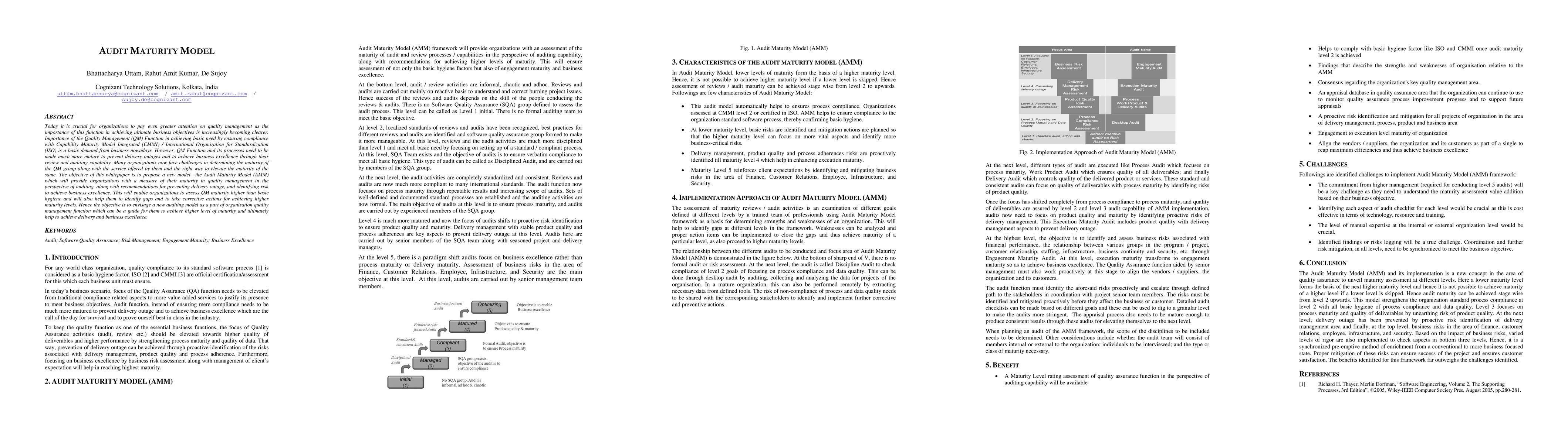 Today it is crucial for organizations to pay even greater attention on quality management as the importance of this function in achieving ultimate business objectives is increasingly becoming clearer. Importance of the Quality Management Function in achieving basic need by ensuring compliance with Capability Maturity Model Integrated or International Organization for Standardization is a basic demand from business nowadays. However, Quality Management Function and its processes need to be made much more mature to prevent delivery outages and to achieve business excellence through their review and auditing capability. Many organizations now face challenges in determining the maturity of the Quality Management group along with the service offered by them and the right way to elevate the maturity of the same. The objective of this whitepaper is to propose a new model, the Audit Maturity Model which will provide organizations with a measure of their maturity in quality management in the perspective of auditing, along with recommendations for preventing delivery outage, and identifying risk to achieve business excellence. This will enable organizations to assess Quality Management maturity higher than basic hygiene and will also help them to identify gaps and to take corrective actions for achieving higher maturity levels. Hence the objective is to envisage a new auditing model as a part of organisation quality management function which can be a guide for them to achieve higher level of maturity and ultimately help to achieve delivery and business excellence.