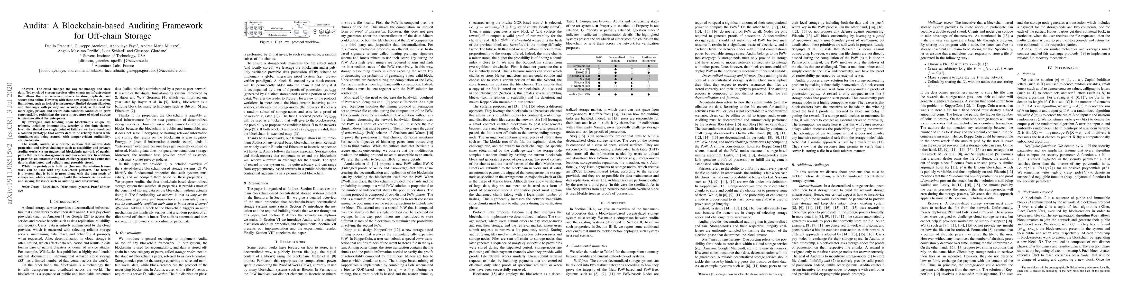 The cloud changed the way we manage and store data. Today, cloud storage services offer clients an infrastructure that allows them a convenient source to store, replicate, and secure data online. However, with these new capabilities also come limitations, such as lack of transparency, limited decentralization, and challenges with privacy and security. And, as the need for more agile, private and secure data solutions continues to grow exponentially, rethinking the current structure of cloud storage is mission-critical for enterprises. By leveraging and building upon blockchain's unique attributes, including immutability, security to the data element level, distributed (no single point of failure), we have developed a solution prototype that allows data to be reliably stored while simultaneously being secured, with tamper-evident auditability, via blockchain. The result, Audita, is a flexible solution that assures data protection and solves challenges such as scalability and privacy. Audita works via an augmented blockchain network of participants that include storage-nodes and block-creators. In addition, it provides an automatic and fair challenge system to assure that data is distributed and reliably and provably stored. While the prototype is built on Quorum, the solution framework can be used with any blockchain platform. The benefit is a system that is built to grow along with the data needs of enterprises, while continuing to build the network via incentives and solving for issues such as auditing and outsourcing.