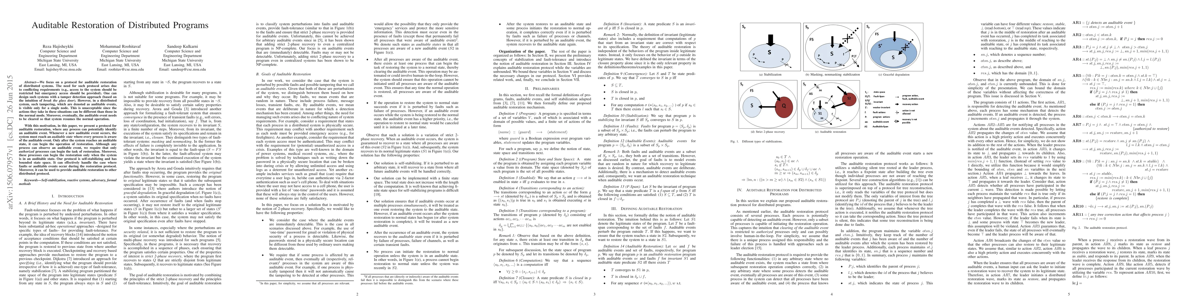 This paper proposes a protocol for auditable restoration in distributed systems, ensuring that all processes recognize auditable events collectively before restoration begins. The protocol is self-stabilizing and manages faults or events during restoration, maintaining a bounded state space.