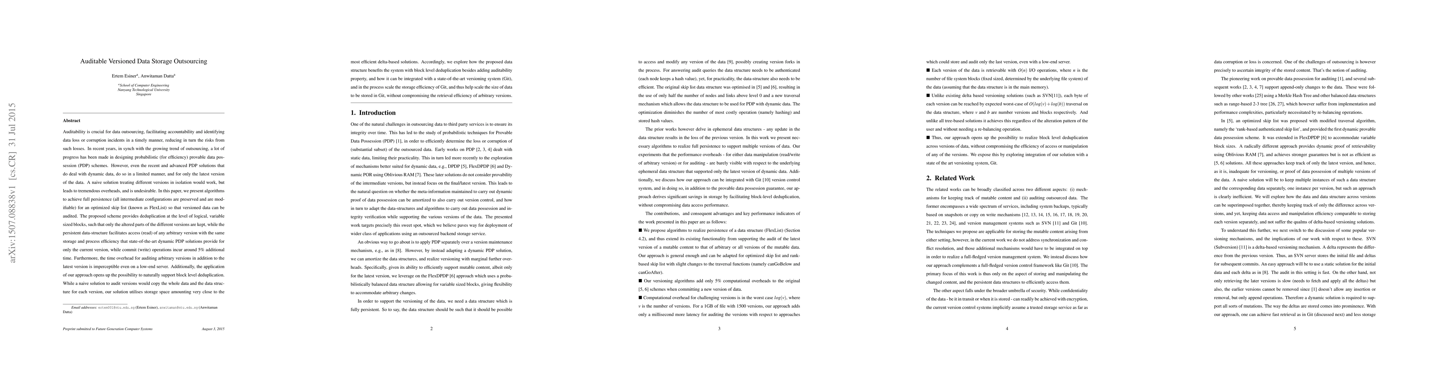 Auditability is crucial for data outsourcing, facilitating accountability and identifying data loss or corruption incidents in a timely manner, reducing in turn the risks from such losses. In recent years, in synch with the growing trend of outsourcing, a lot of progress has been made in designing probabilistic (for efficiency) provable data possession (PDP) schemes. However, even the recent and advanced PDP solutions that do deal with dynamic data, do so in a limited manner, and for only the latest version of the data. A naive solution treating different versions in isolation would work, but leads to tremendous overheads, and is undesirable. In this paper, we present algorithms to achieve full persistence (all intermediate configurations are preserved and are modifiable) for an optimized skip list (known as FlexList) so that versioned data can be audited. The proposed scheme provides deduplication at the level of logical, variable sized blocks, such that only the altered parts of the different versions are kept, while the persistent data-structure facilitates access (read) of any arbitrary version with the same storage and process efficiency that state-of-the-art dynamic PDP solutions provide for only the current version, while commit (write) operations incur around 5% additional time. Furthermore, the time overhead for auditing arbitrary versions in addition to the latest version is imperceptible even on a low-end server...