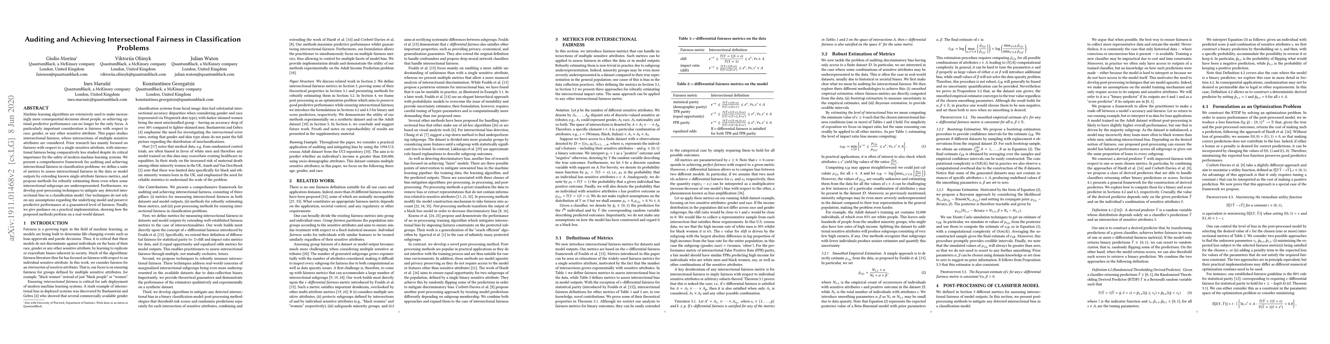 This paper introduces a framework for auditing and achieving intersectional fairness in classification, extending single-attribute fairness metrics to consider multiple sensitive attributes. It proposes methods to mitigate detected intersectional bias without compromising predictive performance, and demonstrates practical implementation on a real-world dataset.