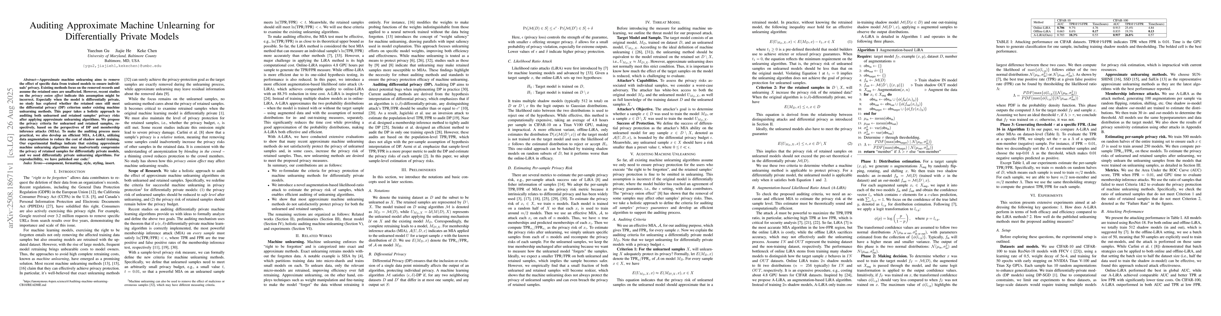 Approximate machine unlearning aims to remove the effect of specific data from trained models to ensure individuals' privacy. Existing methods focus on the removed records and assume the retained ones are unaffected. However, recent studies on the \emph{privacy onion effect} indicate this assumption might be incorrect. Especially when the model is differentially private, no study has explored whether the retained ones still meet the differential privacy (DP) criterion under existing machine unlearning methods. This paper takes a holistic approach to auditing both unlearned and retained samples' privacy risks after applying approximate unlearning algorithms. We propose the privacy criteria for unlearned and retained samples, respectively, based on the perspectives of DP and membership inference attacks (MIAs). To make the auditing process more practical, we also develop an efficient MIA, A-LiRA, utilizing data augmentation to reduce the cost of shadow model training. Our experimental findings indicate that existing approximate machine unlearning algorithms may inadvertently compromise the privacy of retained samples for differentially private models, and we need differentially private unlearning algorithms. For reproducibility, we have pubished our code: https://anonymous.4open.science/r/Auditing-machine-unlearning-CB10/README.md
