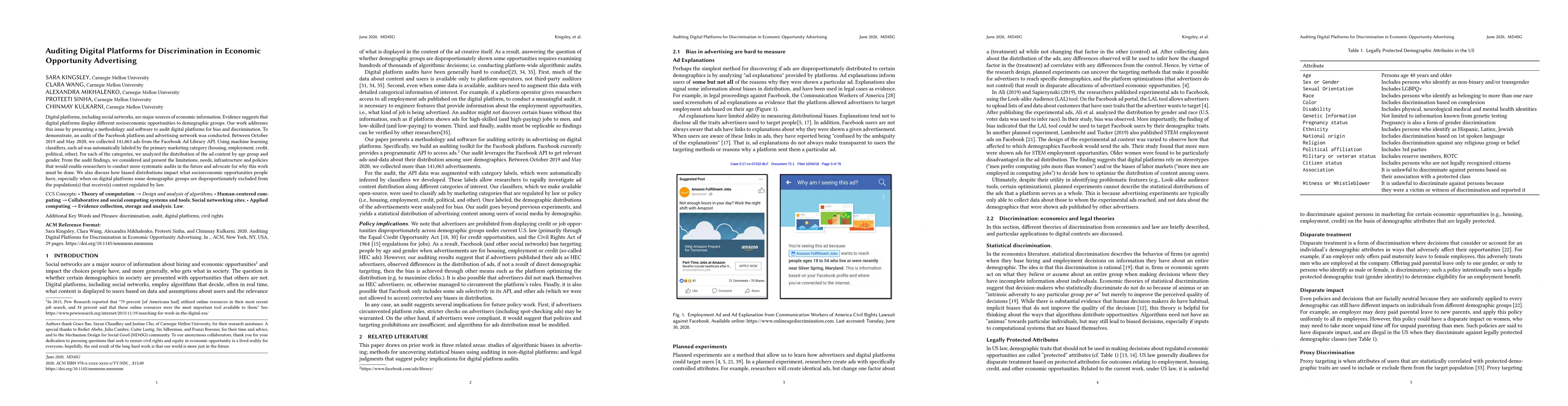 This research develops a methodology and software to audit digital platforms for discrimination, specifically analyzing Facebook's advertising network for biased socioeconomic opportunities. The study found disparities in ad distribution by age and gender, highlighting the need for systematic audits and policy changes to address these biases.