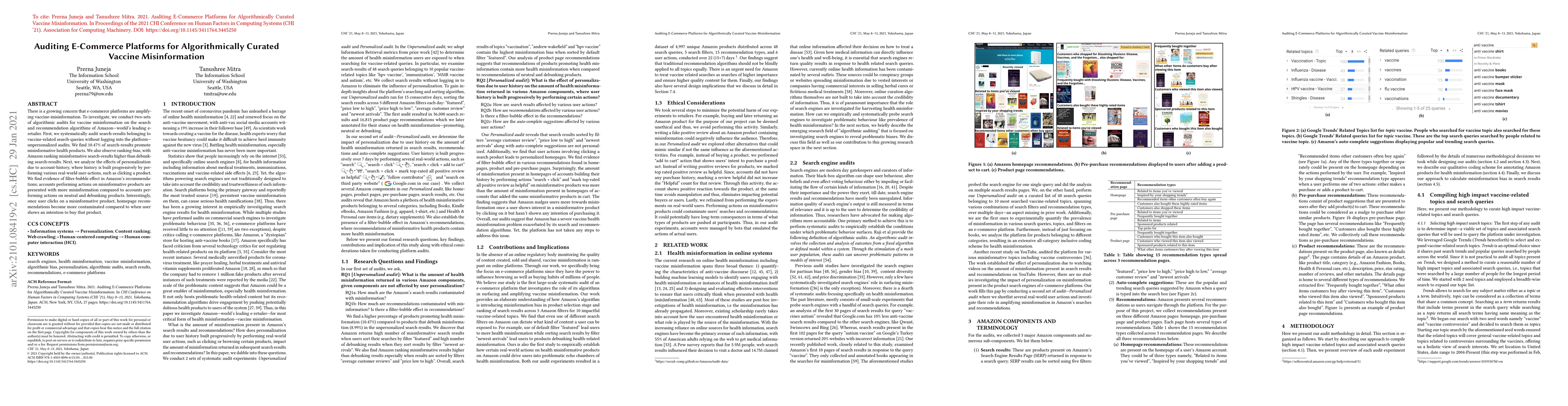 There is a growing concern that e-commerce platforms are amplifying vaccine-misinformation. To investigate, we conduct two-sets of algorithmic audits for vaccine misinformation on the search and recommendation algorithms of Amazon -- world's leading e-retailer. First, we systematically audit search-results belonging to vaccine-related search-queries without logging into the platform -- unpersonalized audits. We find 10.47% of search-results promote misinformative health products. We also observe ranking-bias, with Amazon ranking misinformative search-results higher than debunking search-results. Next, we analyze the effects of personalization due to account-history, where history is built progressively by performing various real-world user-actions, such as clicking a product. We find evidence of filter-bubble effect in Amazon's recommendations; accounts performing actions on misinformative products are presented with more misinformation compared to accounts performing actions on neutral and debunking products. Interestingly, once user clicks on a misinformative product, homepage recommendations become more contaminated compared to when user shows an intention to buy that product.