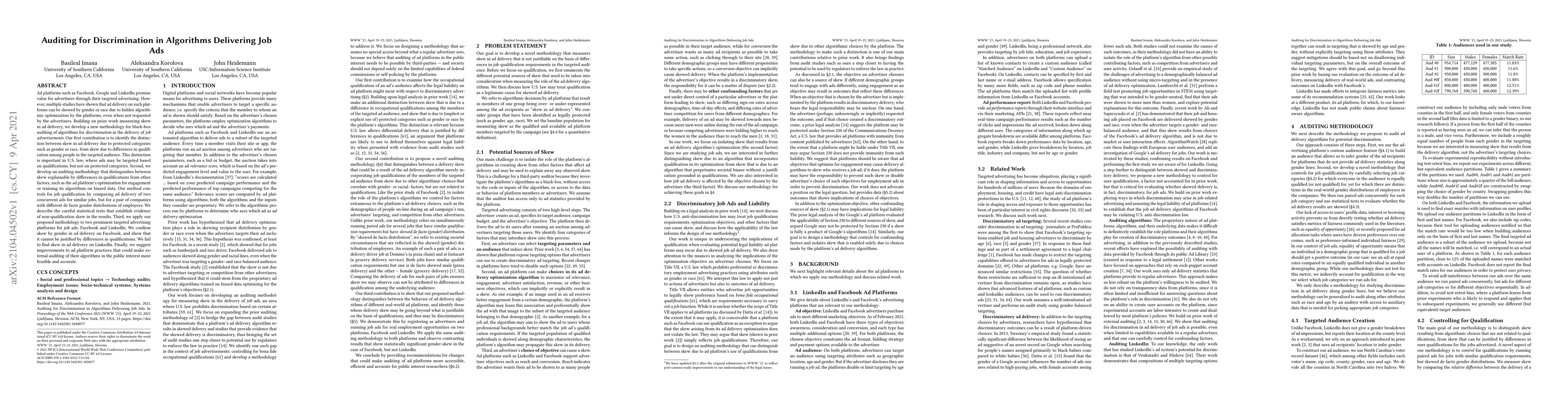 This paper develops a new methodology for auditing algorithms on ad platforms like Facebook and LinkedIn for gender and racial bias in job ad delivery. It distinguishes between justified qualification-based skew and unjustified discrimination, applying the method to find gender bias in Facebook's ads but not LinkedIn's, and suggests improvements for more accurate external auditing.