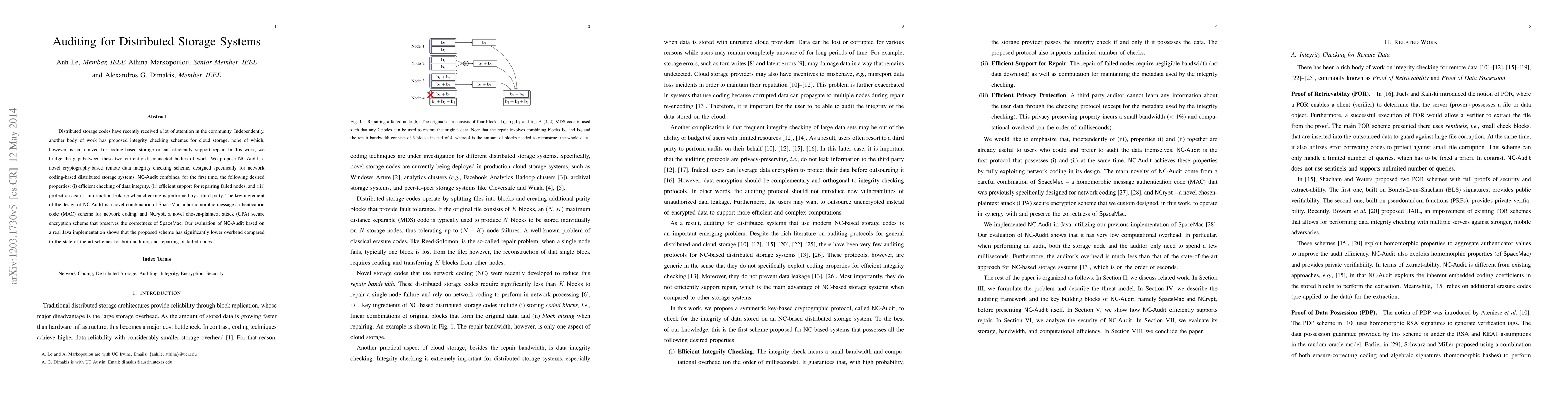 This paper proposes NC-Audit, a novel remote data integrity checking scheme for network coding-based distributed storage systems, combining efficient integrity checking, repair support, and information leakage protection. The scheme integrates SpaceMac and NCrypt to achieve these goals, demonstrating lower computational costs and bandwidth usage compared to existing methods.