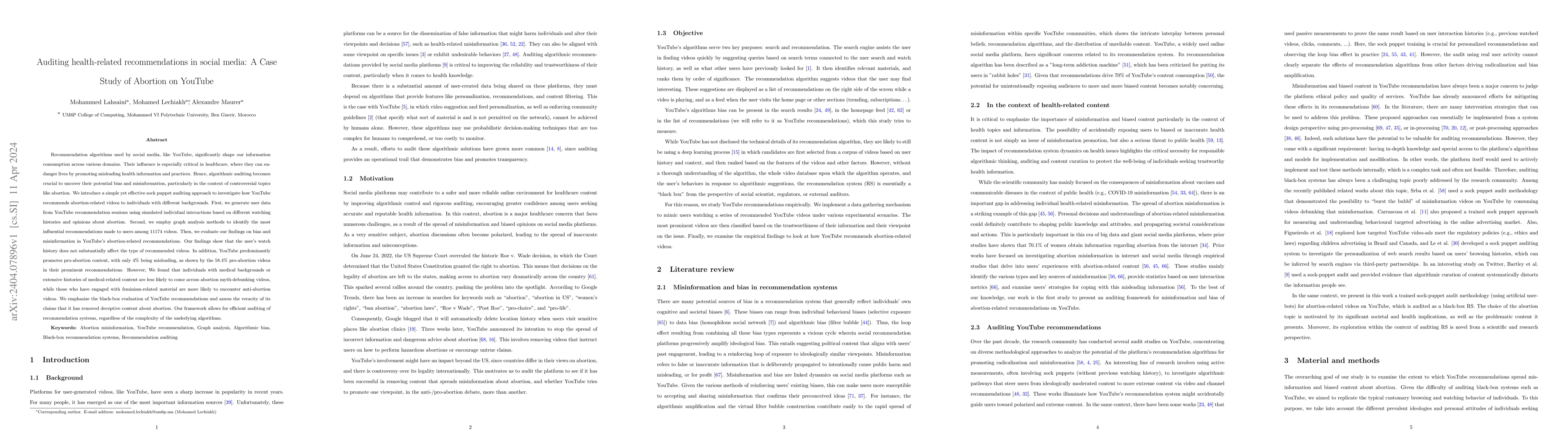This study employs a sock puppet auditing method to examine YouTube's recommendation algorithms for abortion-related content, revealing biases and misinformation risks in health-related social media recommendations, particularly on sensitive topics. The approach enables effective, scalable auditing of recommendation systems regardless of algorithmic complexity.