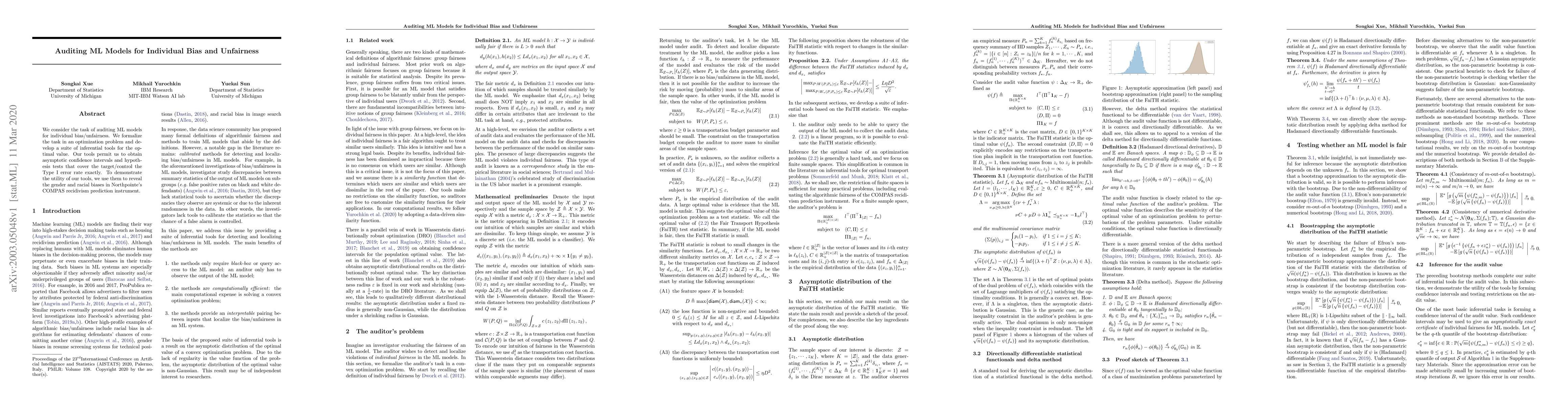 Researchers develop tools to audit machine learning models for individual bias and unfairness, revealing gender and racial biases in a recidivism prediction instrument. Their methods provide asymptotic confidence intervals and hypothesis tests for detecting bias.