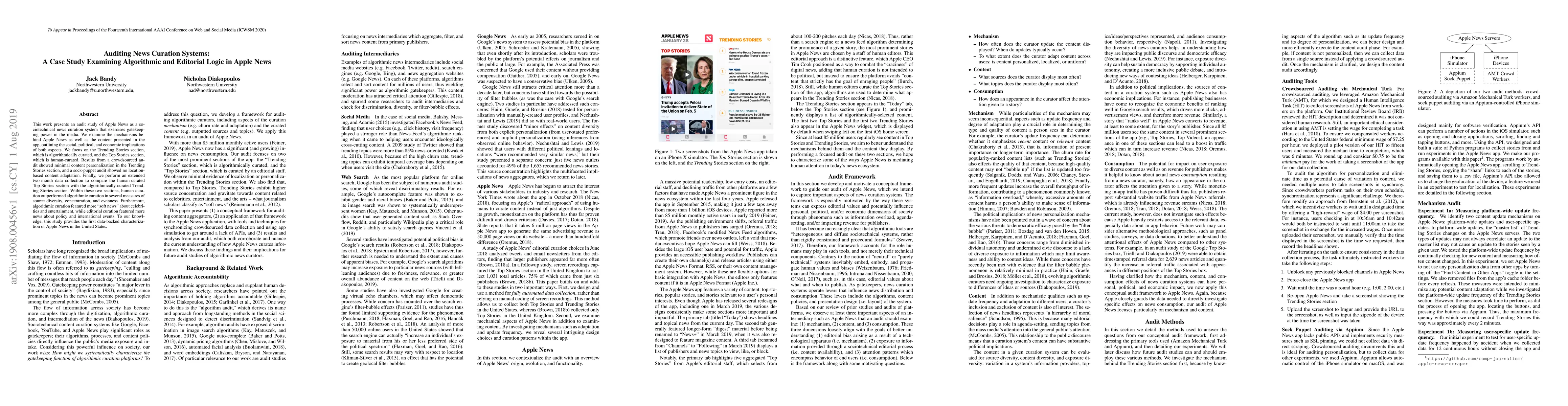 This study audits Apple News, comparing the algorithmic Trending Stories with human-curated Top Stories, revealing that human curation offers more diverse and policy-focused content compared to the algorithmically driven section. The research highlights the sociotechnical implications of curation methods in news platforms.