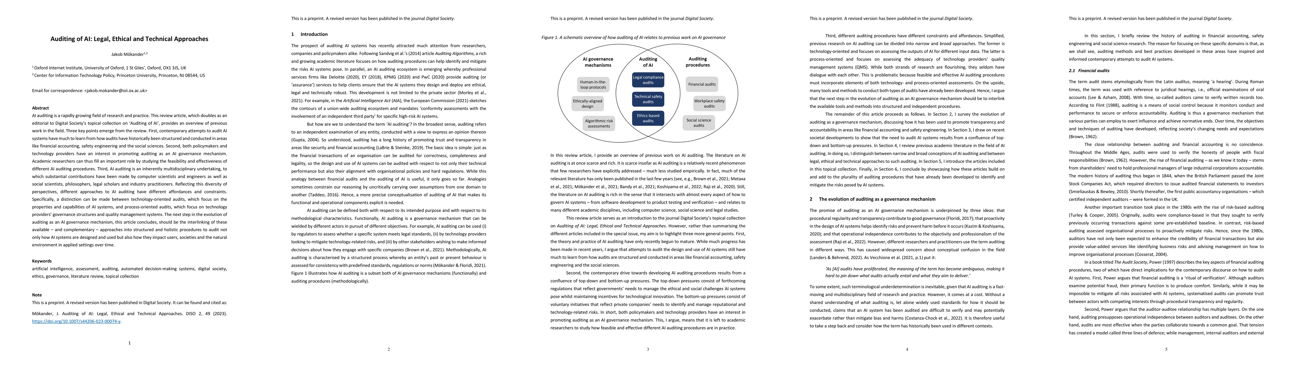 AI auditing is a rapidly growing field of research and practice. This review article, which doubles as an editorial to Digital Societys topical collection on Auditing of AI, provides an overview of previous work in the field. Three key points emerge from the review. First, contemporary attempts to audit AI systems have much to learn from how audits have historically been structured and conducted in areas like financial accounting, safety engineering and the social sciences. Second, both policymakers and technology providers have an interest in promoting auditing as an AI governance mechanism. Academic researchers can thus fill an important role by studying the feasibility and effectiveness of different AI auditing procedures. Third, AI auditing is an inherently multidisciplinary undertaking, to which substantial contributions have been made by computer scientists and engineers as well as social scientists, philosophers, legal scholars and industry practitioners. Reflecting this diversity of perspectives, different approaches to AI auditing have different affordances and constraints. Specifically, a distinction can be made between technology-oriented audits, which focus on the properties and capabilities of AI systems, and process oriented audits, which focus on technology providers governance structures and quality management systems. The next step in the evolution of auditing as an AI governance mechanism, this article concludes, should be the interlinking of these available (and complementary) approaches into structured and holistic procedures to audit not only how AI systems are designed and used but also how they impact users, societies and the natural environment in applied settings over time.