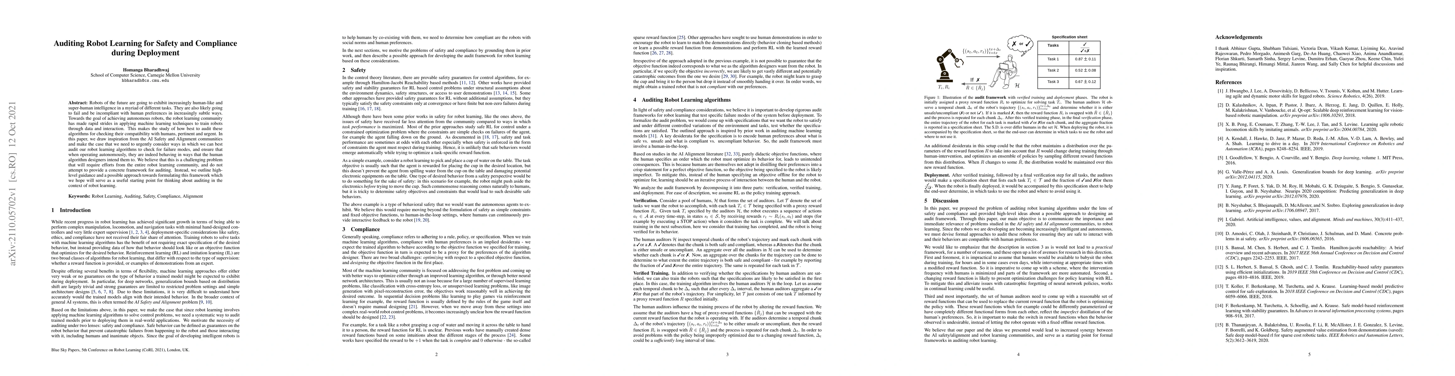 This paper emphasizes the need to audit robot learning algorithms for safety and compliance as they become increasingly sophisticated and autonomous. It proposes a starting point for formulating an auditing framework, highlighting the importance of collaboration across the robot learning community to ensure human-algorithm alignment.