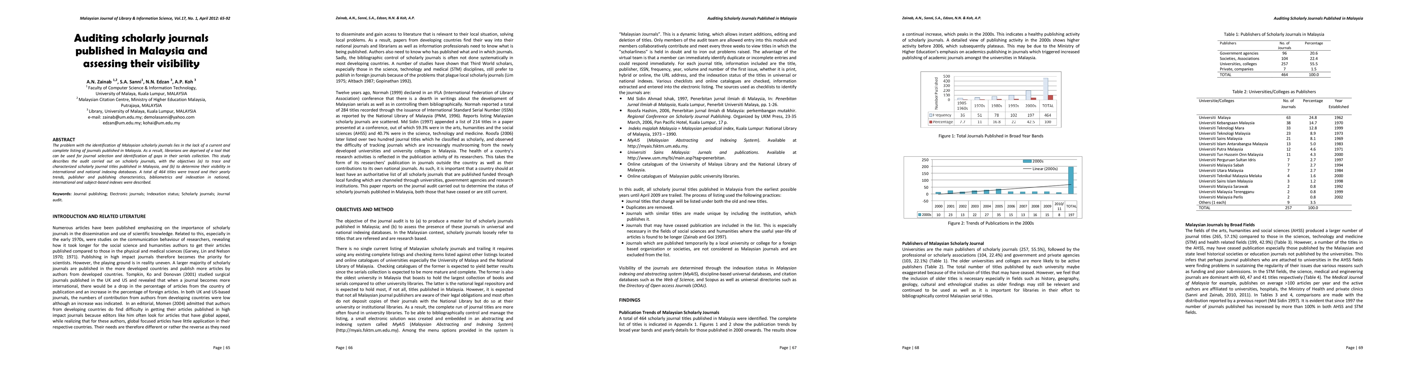 This study audited scholarly journals published in Malaysia to identify and characterize their titles, and assessed their visibility in international and national indexing databases. The findings reveal trends, publisher details, bibliometrics, and indexation status of 464 traced titles.