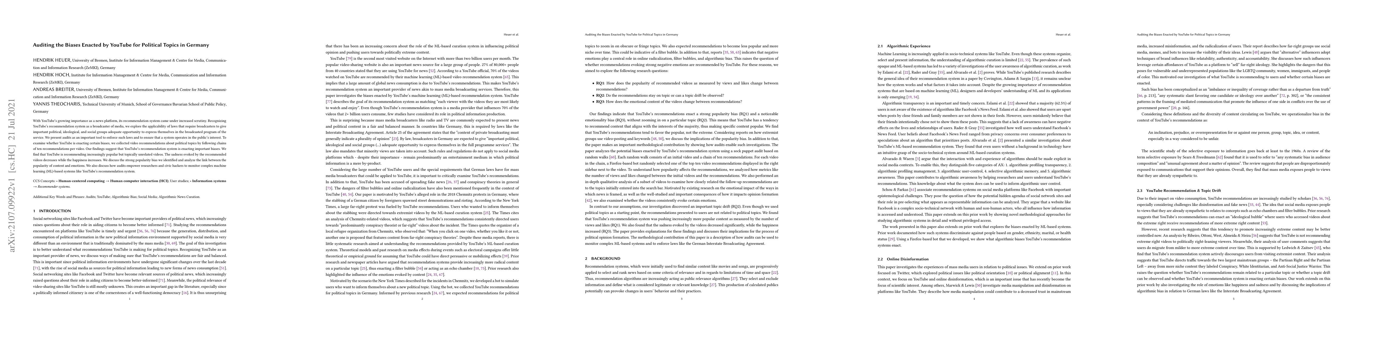 This research examines YouTube's recommendation system for political topics in Germany, finding it enacts significant biases favoring popular but topically unrelated videos, which shift viewer emotions from sadness to happiness. The study highlights the importance of audits to ensure such systems operate in the public's interest.