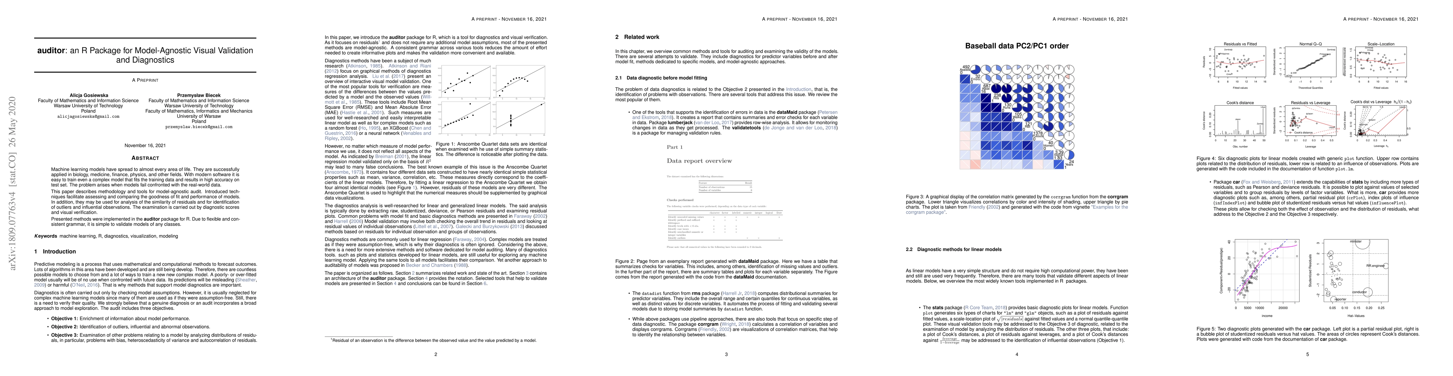This paper introduces the "auditor" R package for model-agnostic visual validation and diagnostics, providing tools to assess and compare model performance, detect outliers, and analyze residuals through diagnostic scores and visual verification. The package is designed to validate models of any class with flexible and consistent grammar.