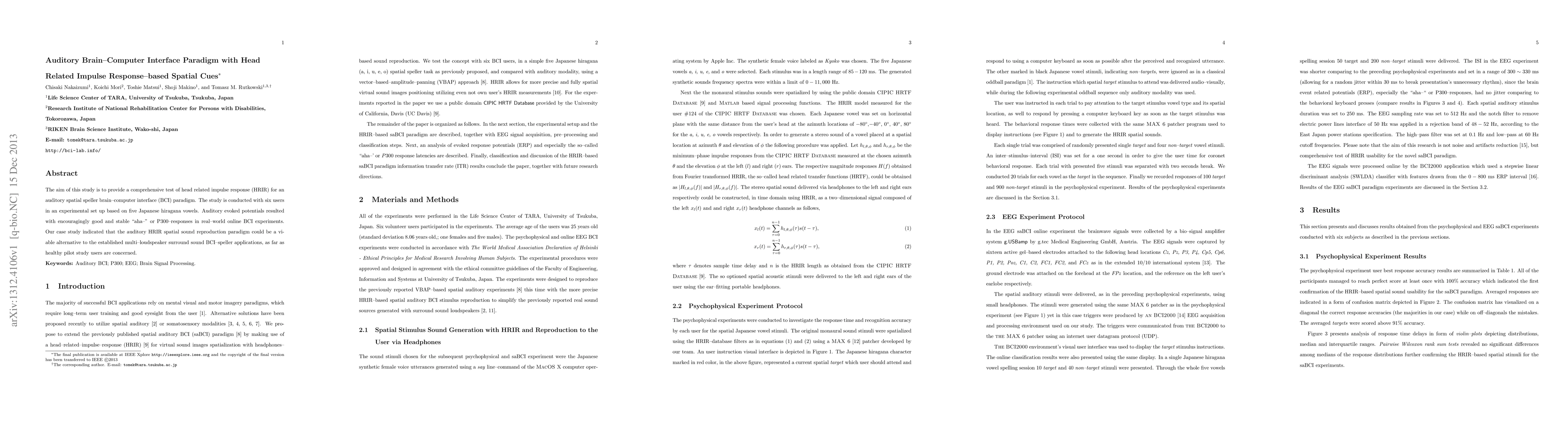 This study tests an auditory brain-computer interface (BCI) using head related impulse response (HRIR) for spatial cues, showing stable P300 responses in six users. The HRIR-based spatial sound paradigm appears to be a viable alternative to traditional multi-loudspeaker BCI-spellers.