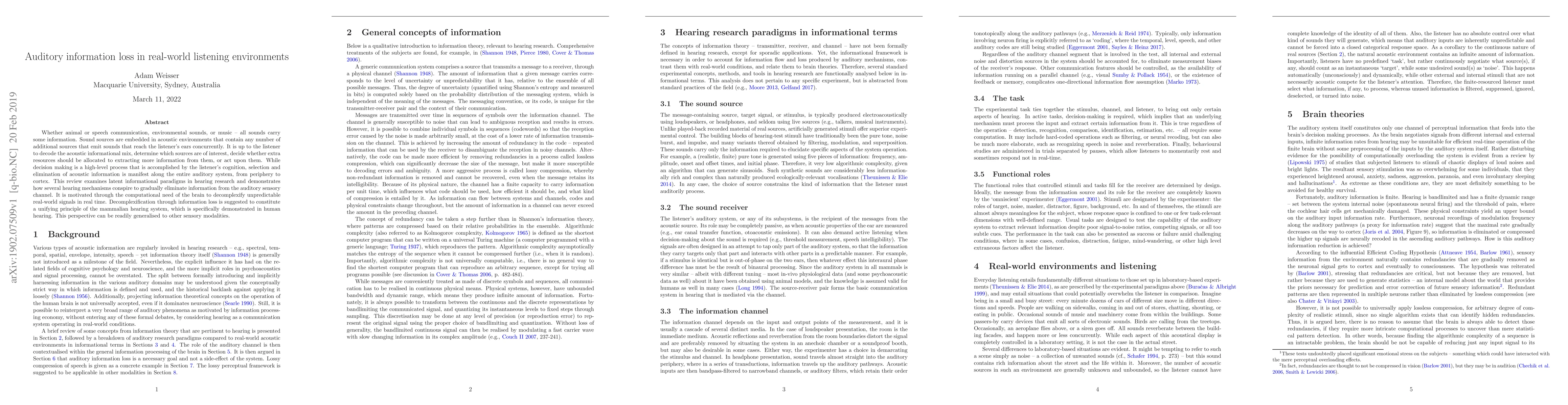 Whether animal or speech communication, environmental sounds, or music -- all sounds carry some information. Sound sources are embedded in acoustic environments that contain any number of additional sources that emit sounds that reach the listener's ears concurrently. It is up to the listener to decode the acoustic informational mix, determine which sources are of interest, decide whether extra resources should be allocated to extracting more information from them, or act upon them. While decision making is a high-level process that is accomplished by the listener's cognition, selection and elimination of acoustic information is manifest along the entire auditory system, from periphery to cortex. This review examines latent informational paradigms in hearing research and demonstrates how several hearing mechanisms conspire to gradually eliminate information from the auditory sensory channel. It is motivated through the computational need of the brain to decomplexify unpredictable real-world signals in real time. Decomplexification through information loss is suggested to constitute a unifying principle of the mammalian hearing system, which is specifically demonstrated in human hearing. This perspective can be readily generalised to other sensory modalities.